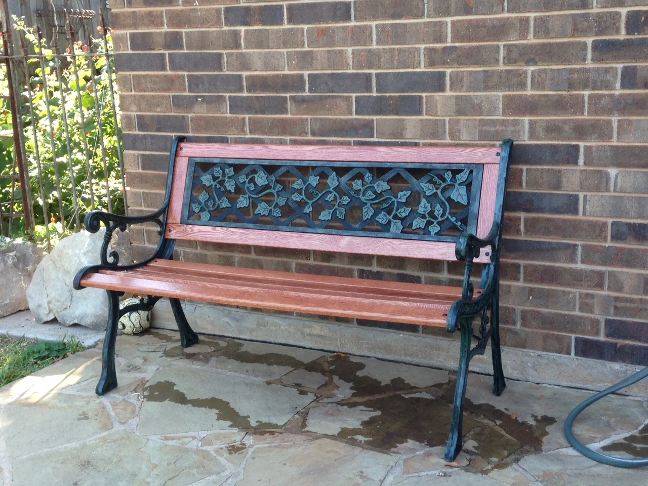 The owner used a stain, and two coats of polyurethane and I think it came out fantastic! I particularly like that the metal doesn't look uniform and painted, I'm guessing he used a clear rust sealer made by Rustoleum I've seen at the Depot for use on garden tools. I honestly think this bench looks better now than when it was brand new. Great work Mike!!