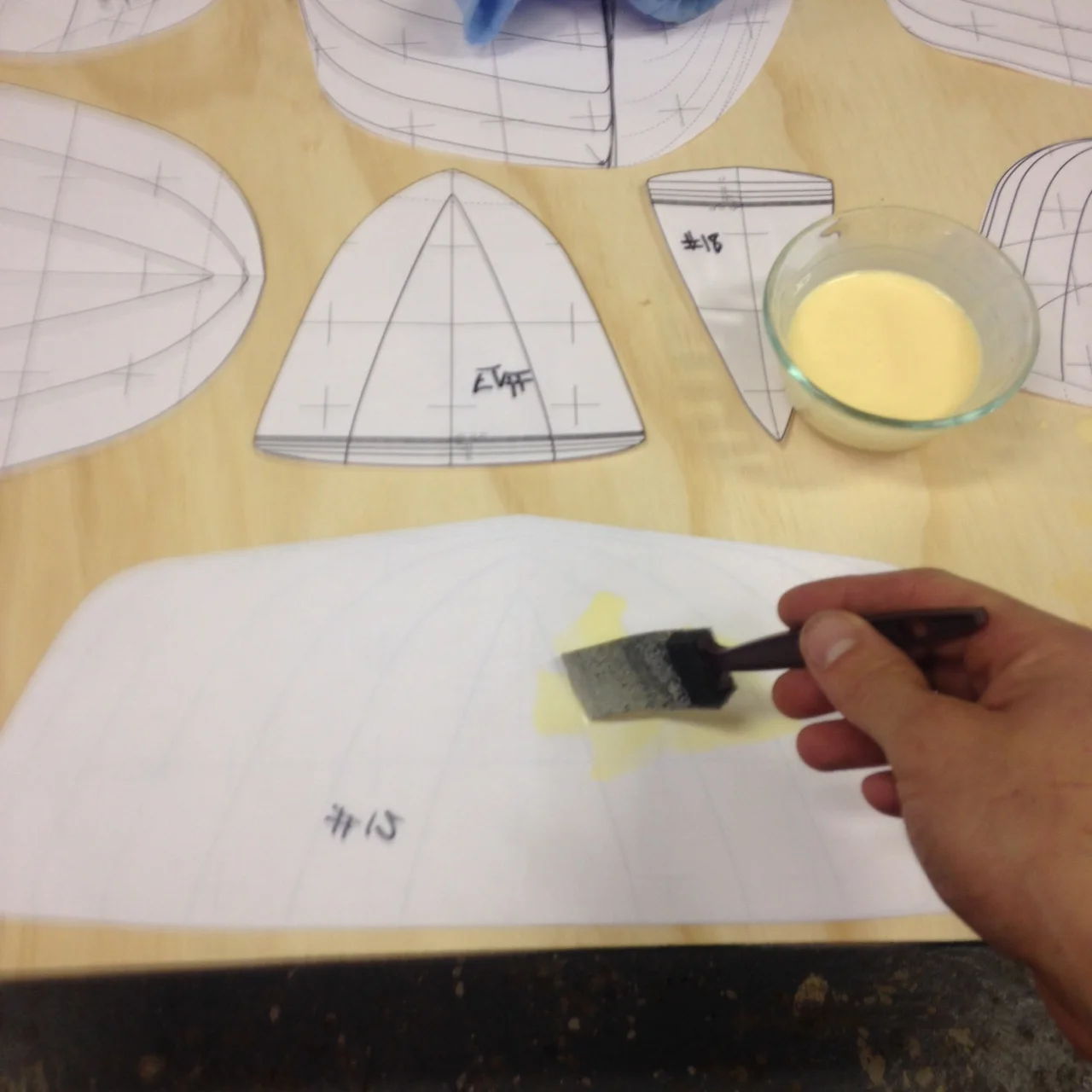 Resin (Epoxy) comes in different mixes that cure at different rates. Since I've done this once before I decided to be a little bold and try a blend that cures more quickly so that in future steps I'll spend less time waiting for glue to cure. However, the hull is the largest area i'll have to wet out with this quick curing epoxy so i'll have to move quick to avoid ruining all my hard work up to this point. Because i was working under a time constraint, I only took one photo of the wet out while it was happening.