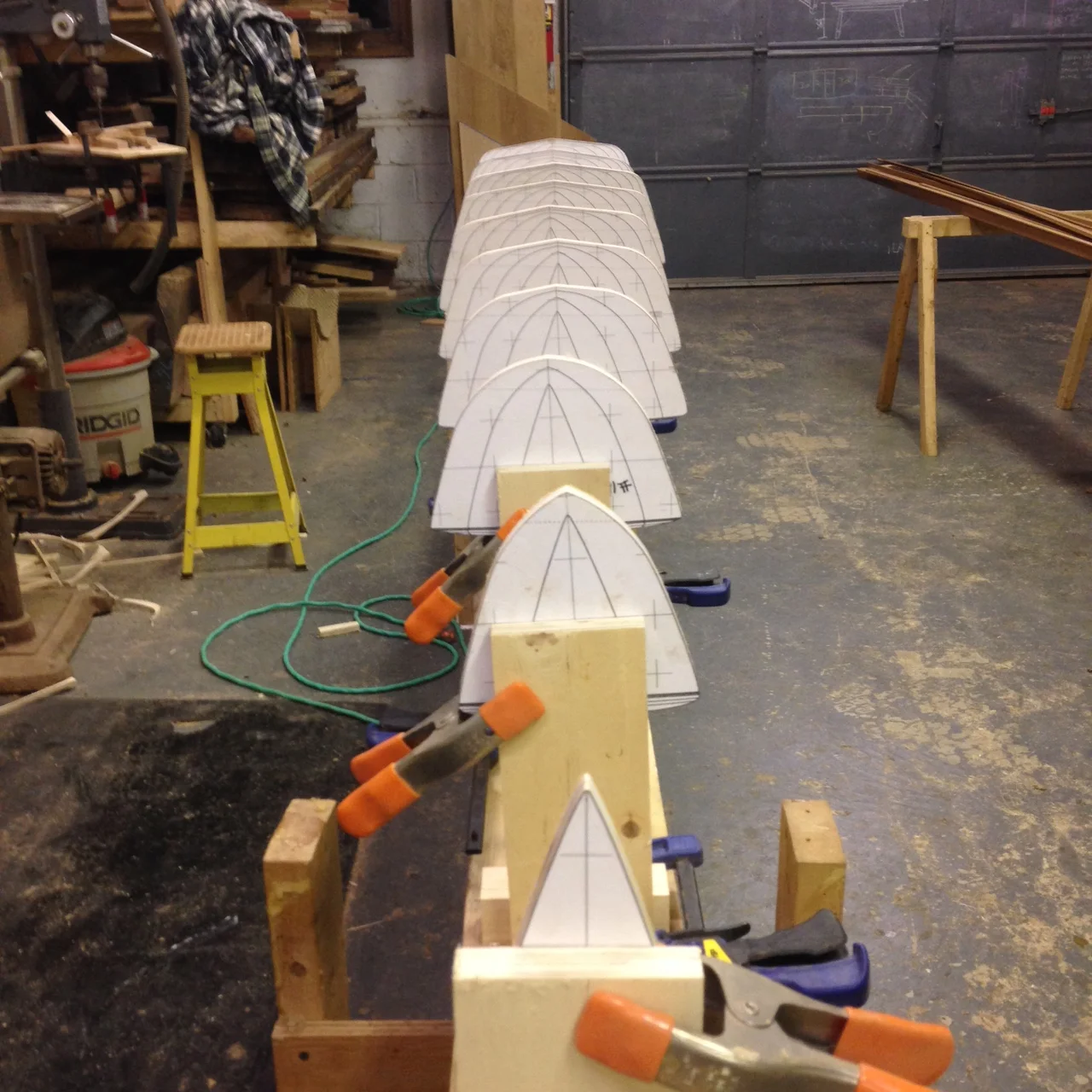 To wrap up my weekend I loosely clamped a few of the stations in place, just to get a little sneak peak of what the hull is going to look like. I'll need to run a top string line and mark center lines of each of the riser blocks before the stations get mounted permanently. It's almost time to start building the actual kayak!