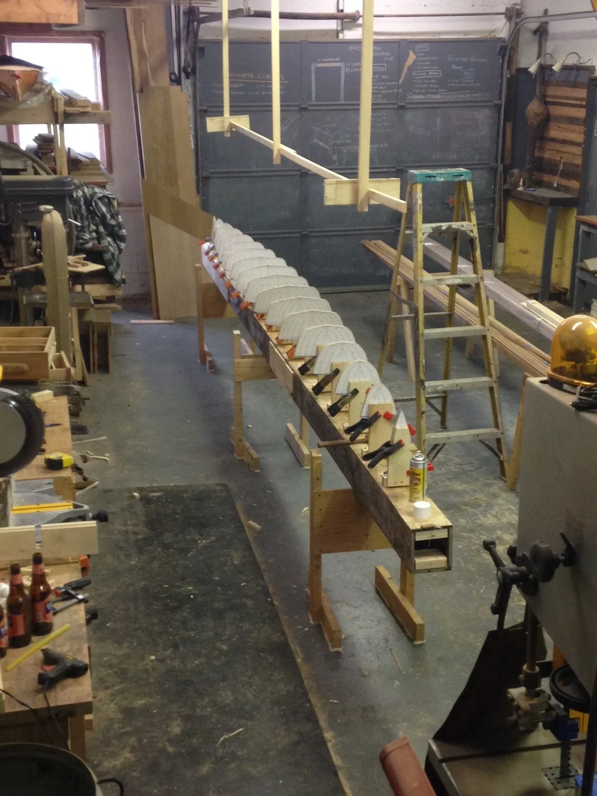 With the forms basically in place, I turned my focus on getting my workspace set up so I can be as efficient as possible. With a 20' long boat its a real pain to have to walk all the way around to the other side to reach a clamp that's only a few feet out of reach. I suspended a light weight and adjustable rack from the ceiling to store all my strips in. This will make it really easy to just reach up and grab a new strip, plus it keeps them totally out of the way and having them high in the air will keep glue drips and misc. crap off them. I made the horizontal member nice and skinny so all my clamps (even the tiny ones) can be clamped on and never be out of reach.