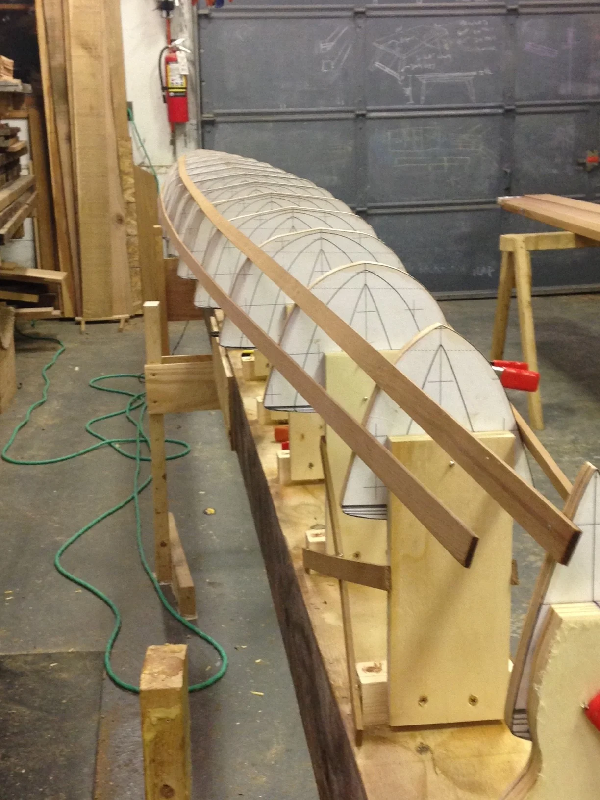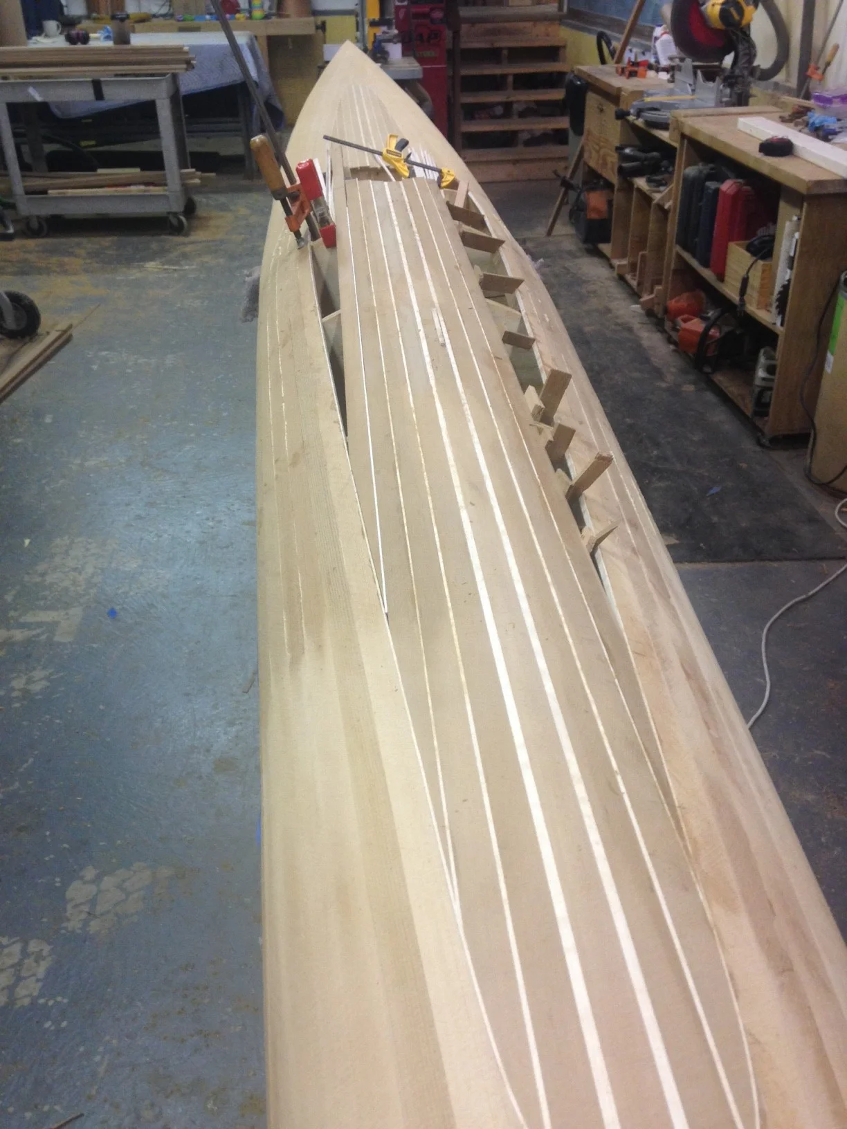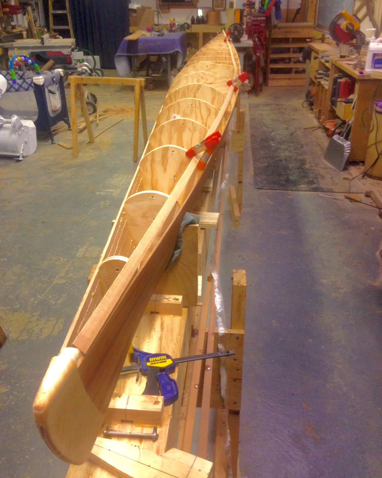 With the bow and stern held firmly aligned by only temporary supports, the next step is to add the "sheer" strips. These are the two starter strips at the widest point of the hull. These need to be aligned perfectly as they ultimately define the smooth curves where the deck meets the hull in the finished product.