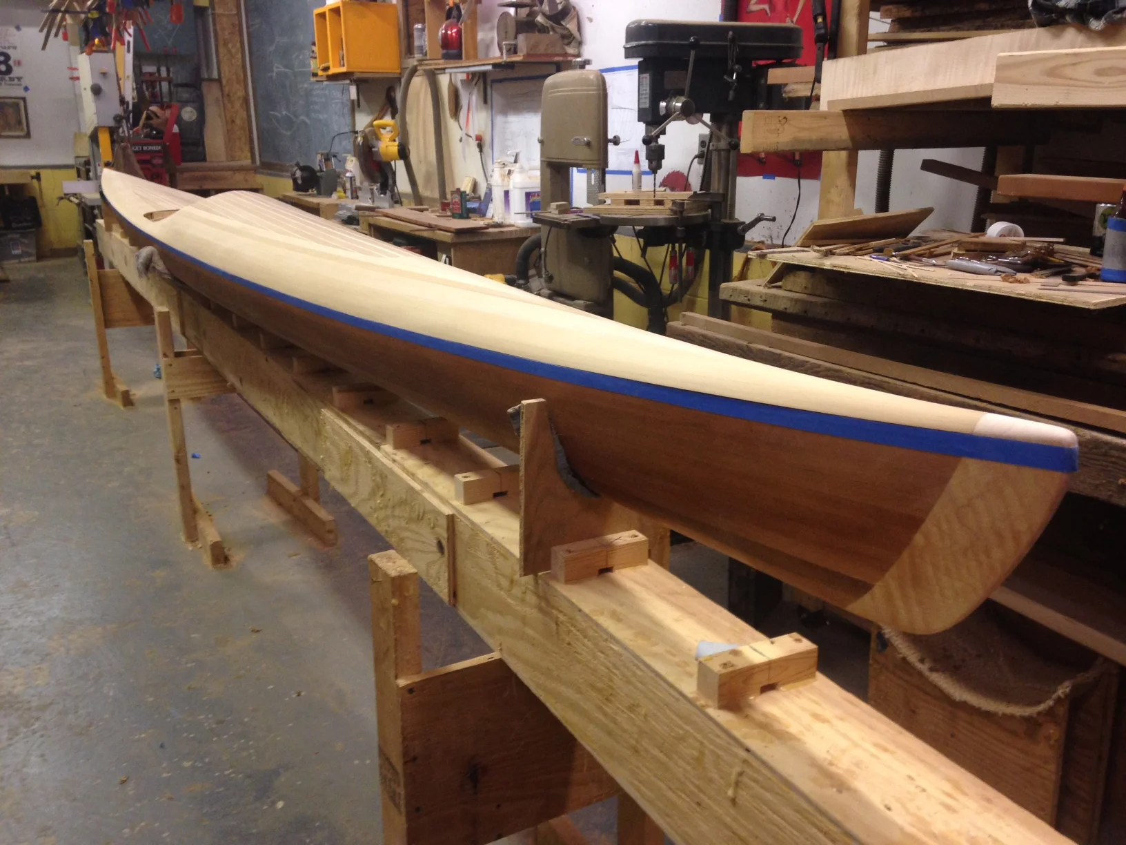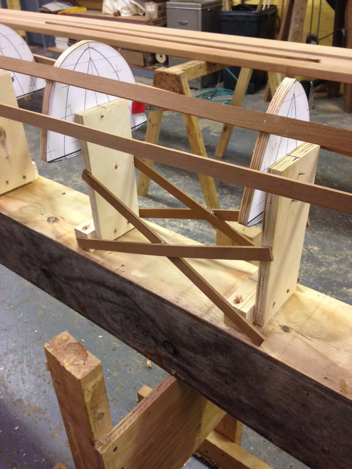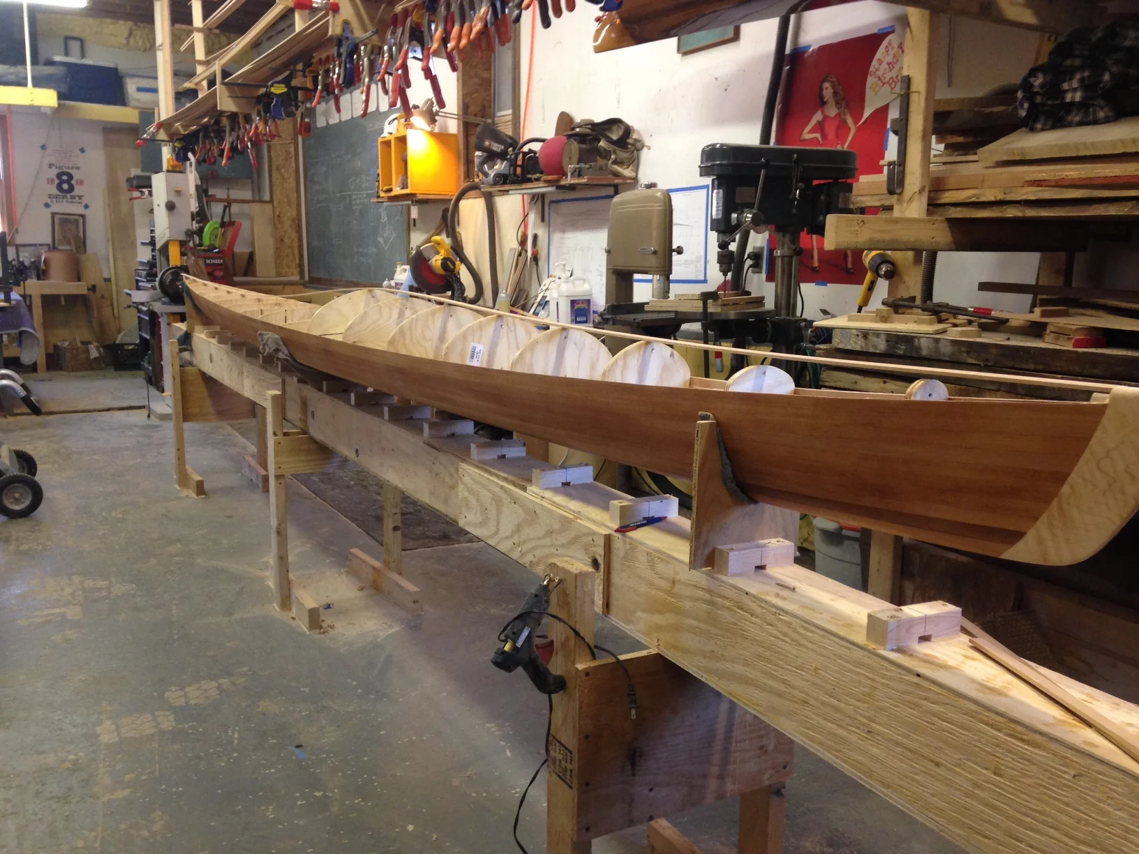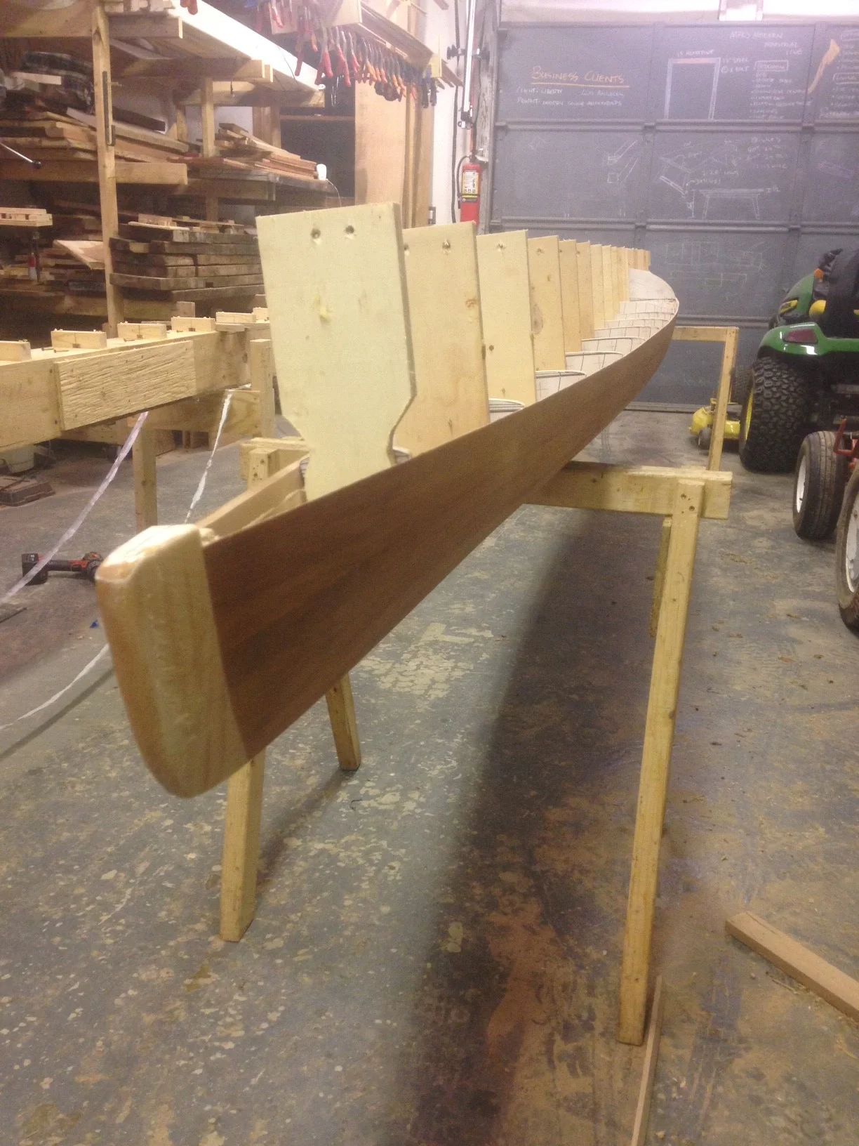 With the bow and stern held firmly aligned by only temporary supports, the next step is to add the "sheer" strips. These are the two starter strips at the widest point of the hull. These need to be aligned perfectly as they ultimately define the smooth curves where the deck meets the hull in the finished product.