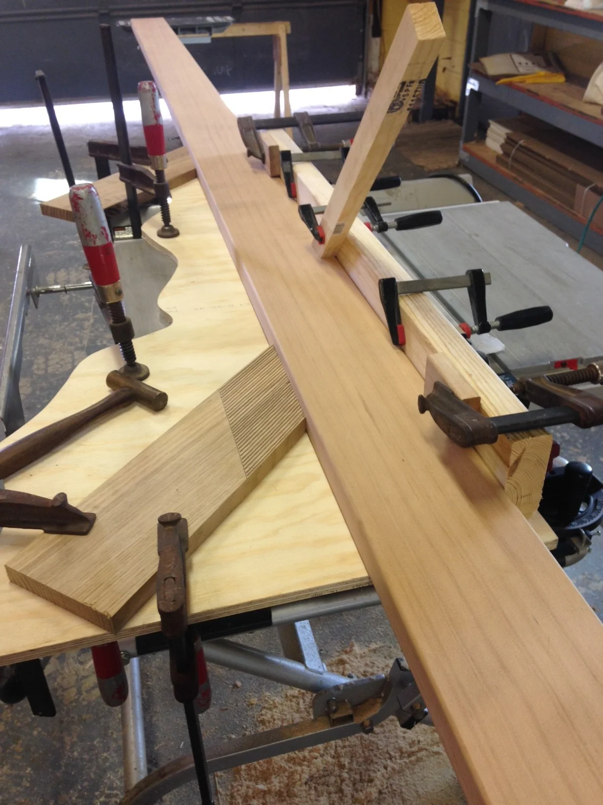 Here i'm using scraps as wedges to fit the taper, and another scrap against the soft cedar to prevent any dents. The maple strip is super hard and didn't require protection.