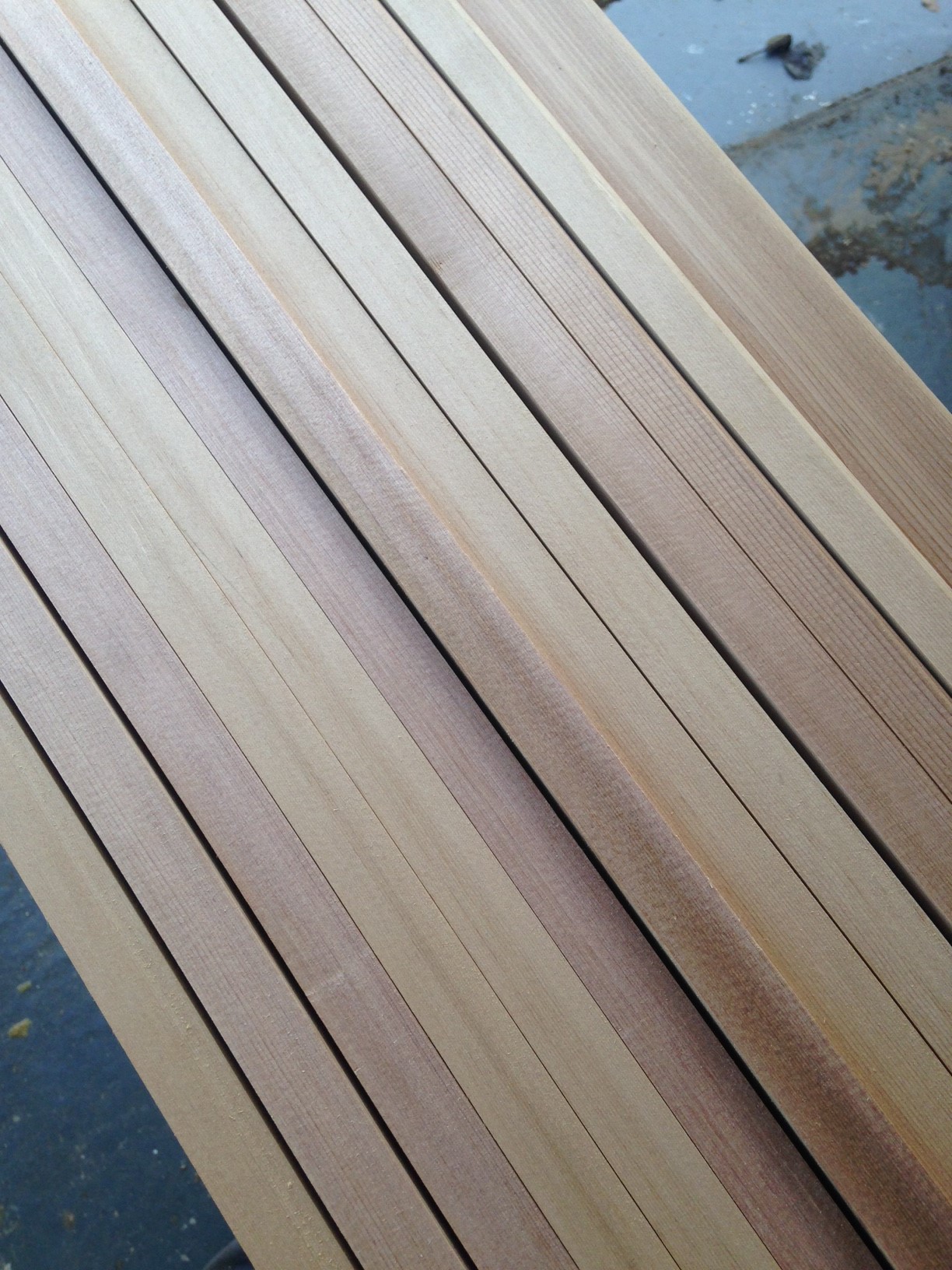 Moving on to cutting the strips. This is a delicate task with no room for error. I was able to source 2 - 20' long 2x6 vertical grain western red cedar boards from a friend who runs a lumber yard in DC. These babies are not cheap, but its pretty special to get to have full length strips with no splice joints on a 20' boat. The grain is amazing, you can put your finger on a growth ring at one end of the board, and follow it 20' to the other end of the board.
