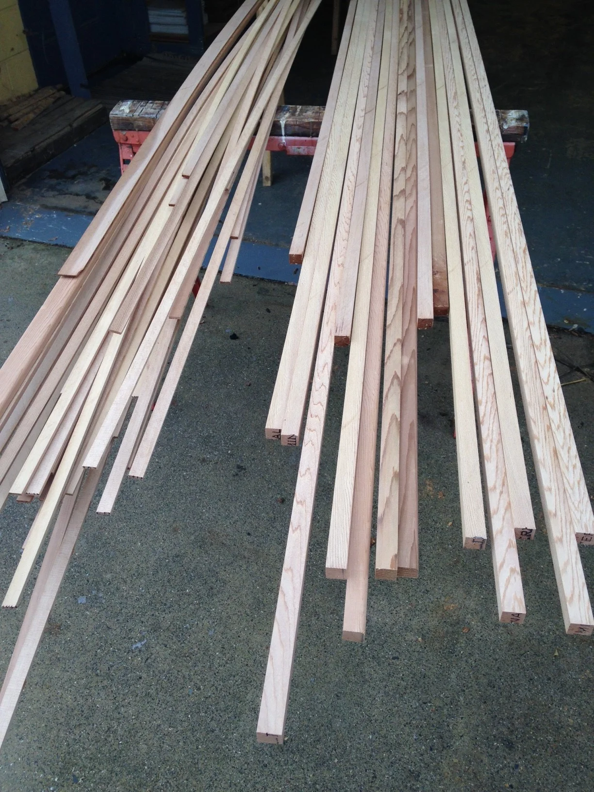 This fence system (combined with infeed and outfeed supports) makes it very safe and easy to cut 20' lengths by yourself. The one downside is that the big oak feather boards have to be repositioned after each cut. After a little while I had this pile of 3/4"x1 1/2" strips.