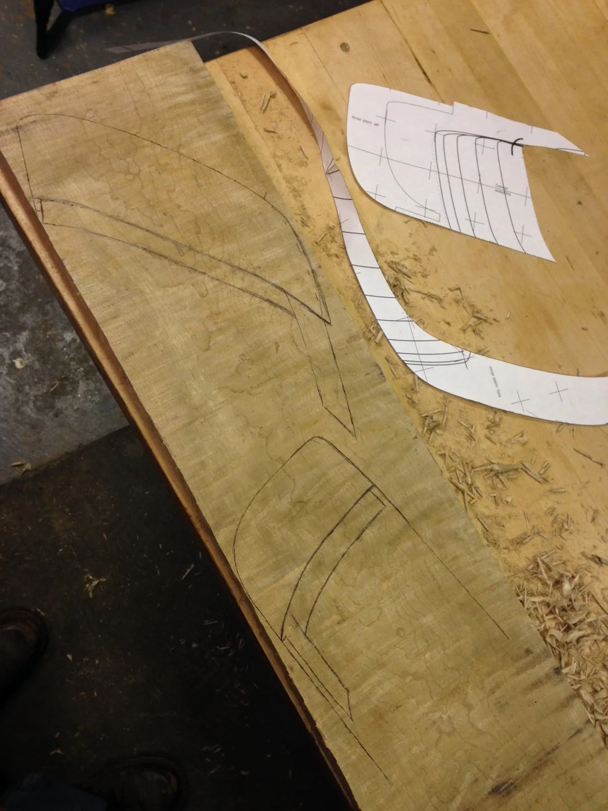 I started with rough sawn curly maple from a buddy in Fredrick. The actual plans call for internal bow and stern reinforcement and gives a template for cutting those pieces. I used them as a rough guide and expanded some of the proportions to get an outline of what the outside profiles should be and traced it on to the rough maple.