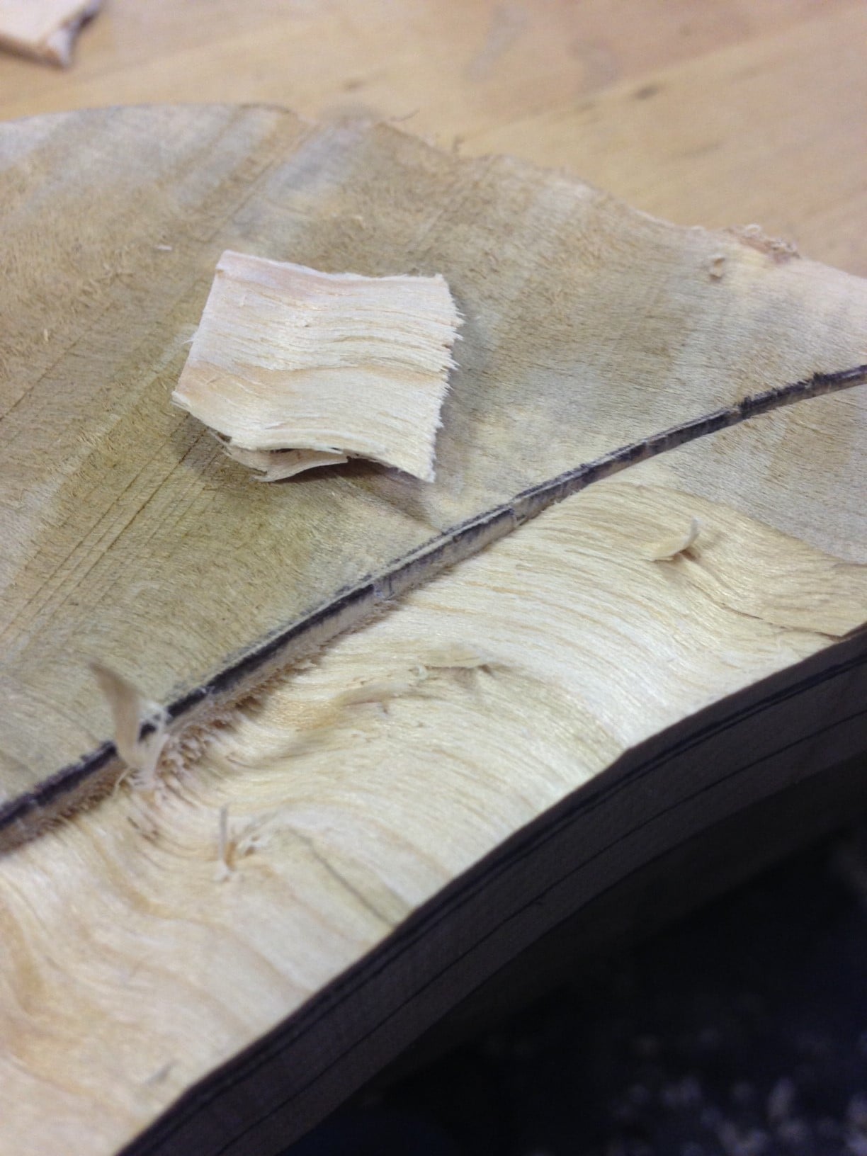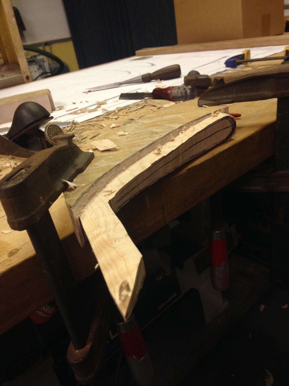 Next I did the same steps with the stern piece, which I should have started with because it is smaller and an easier shape. Here is a good photo of why its challenging to carve curly maple: