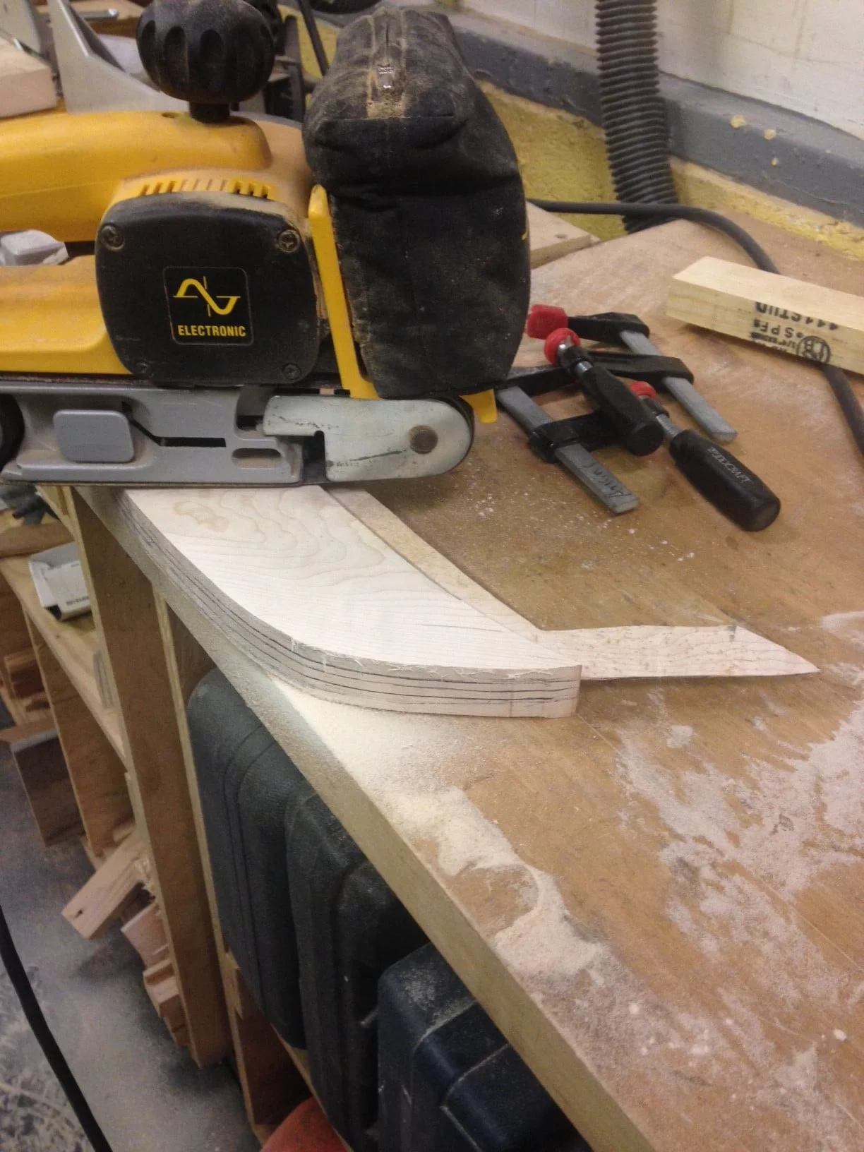 I aimed a fan on the forms for about half an hour to dry the glue, and quickly chopped the sheet up with my jig saw into manageable sizes for my 1950's band saw. On the band saw I cut as close as possible to the paper forms, leaving about 1/64th of visible wood.