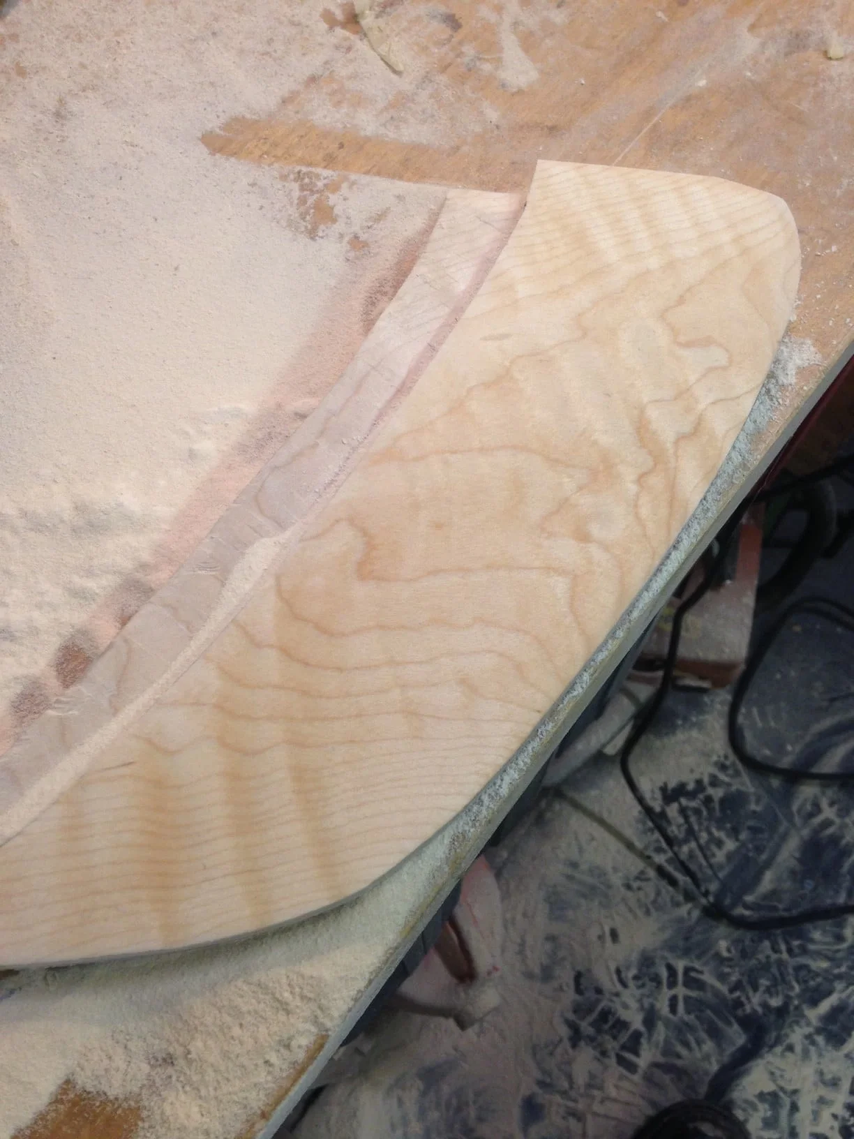 After about 5 minutes for each side I had the general profile roughed out. Just for kicks I sanded one side with 220 grit and rubbed some water on to get a tease for what the curly maple will eventually look like.