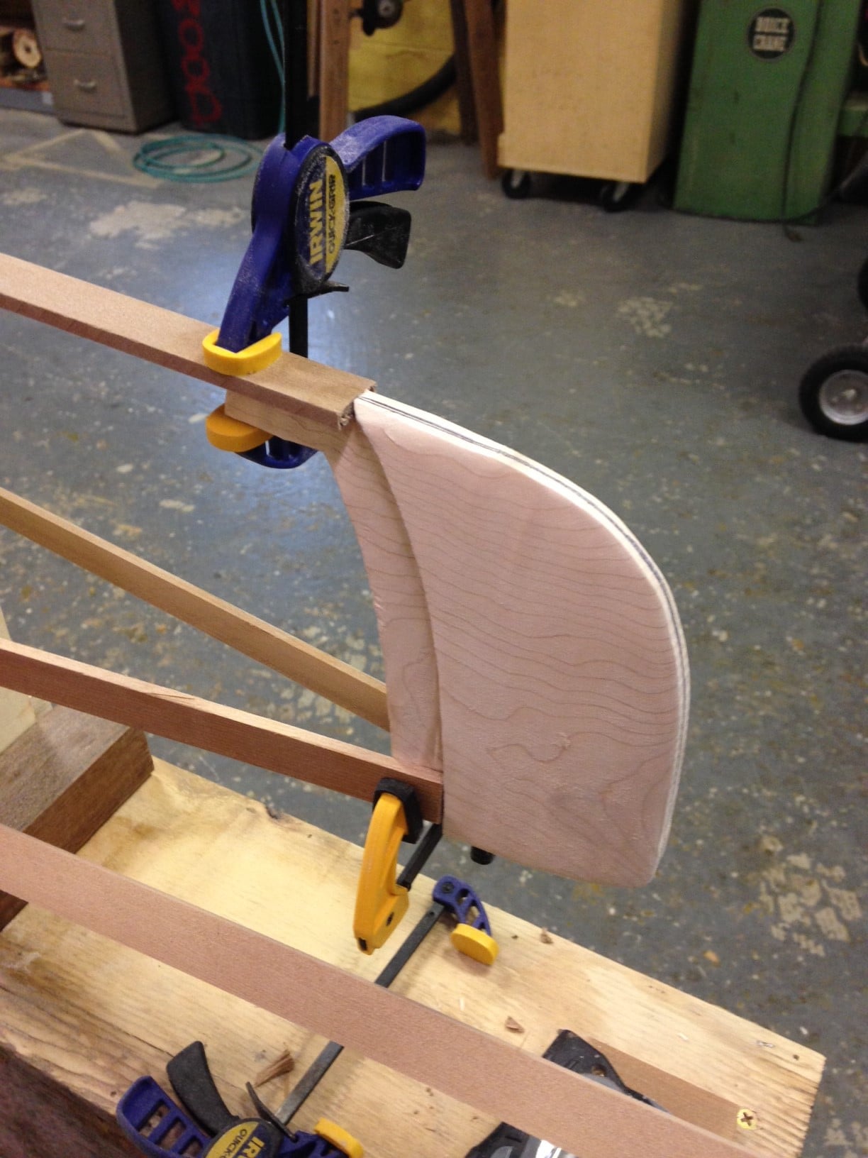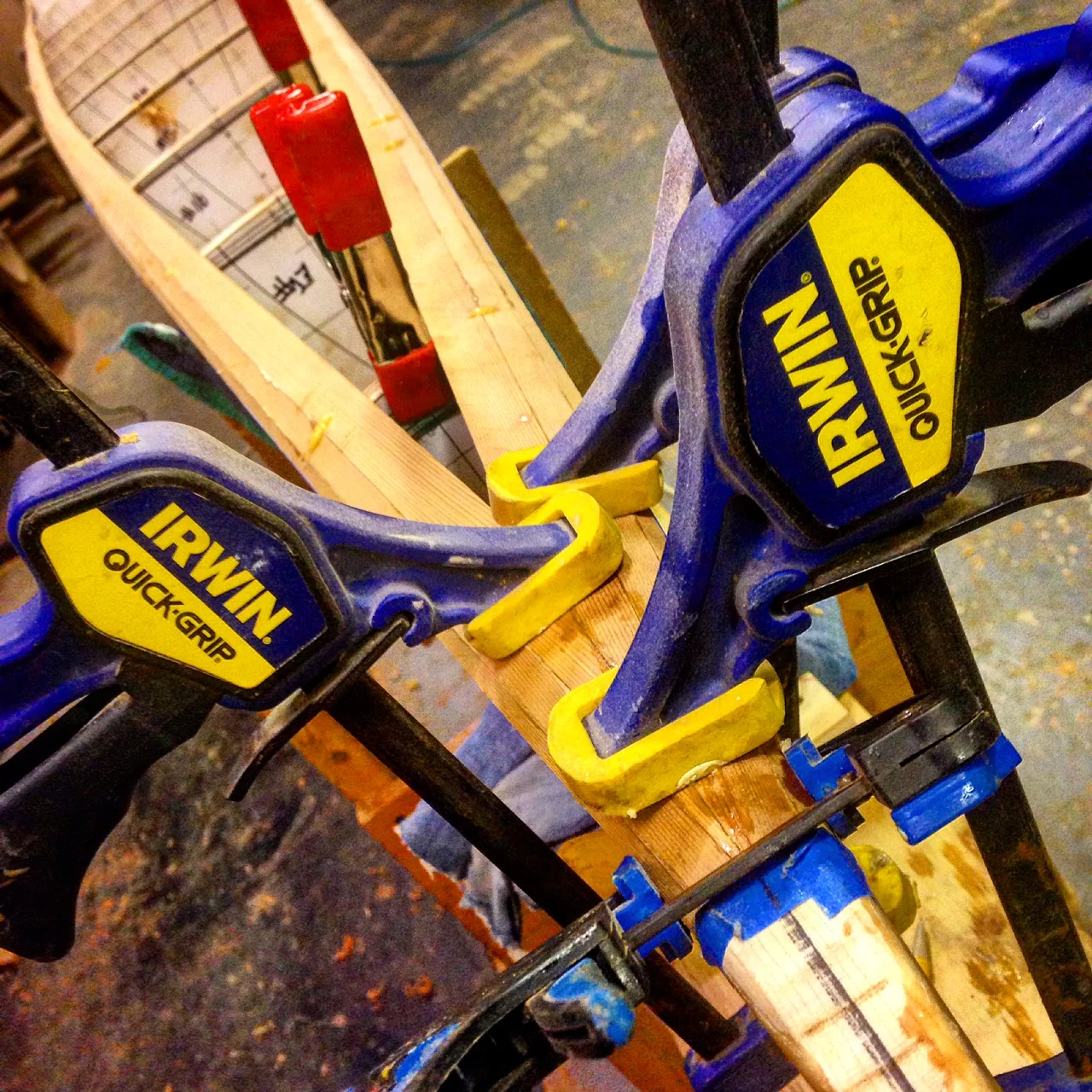 As I got to the final tiny strips the clamping had to get even more creative, trying to get the existing curves of the sides to line up with the new curve created by starting at the center and working out. I cant have any lumps!