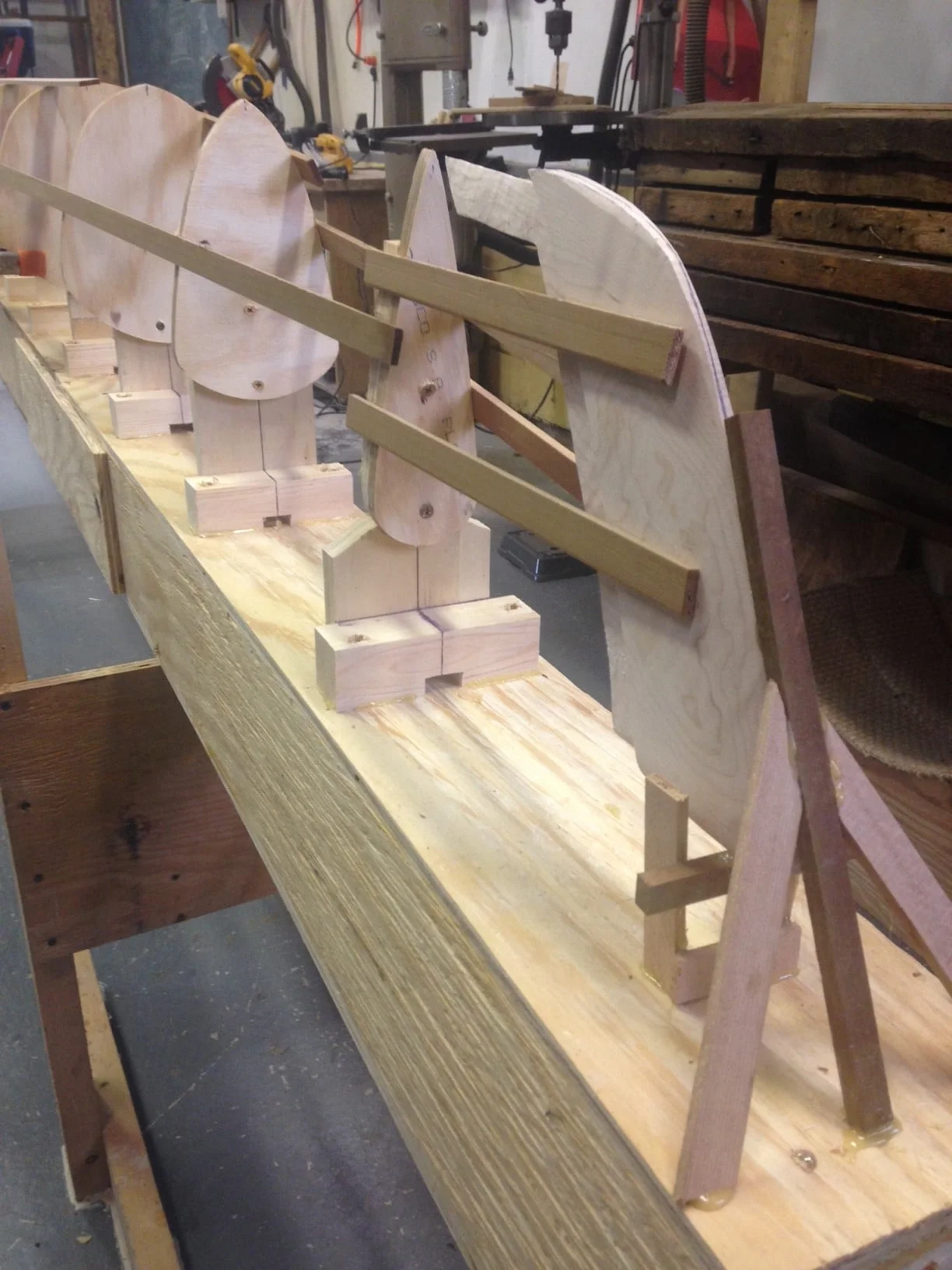 With the rack almost done I got distracted for a bit and started installing temporary full length strips. These strips serve a few different purposes - they hold the forms more securely in place, helping to resist flex and deflection as the strips apply various forces. I installed some diagonal bracing to create an anchor point to pull a tape measure off, so that i can set the tops of the forms at the same 32cm centers that the bases of the form brackets are set on. some stations were as much as 3cm out of tolerance, but easily fixed with the temporary support strips.