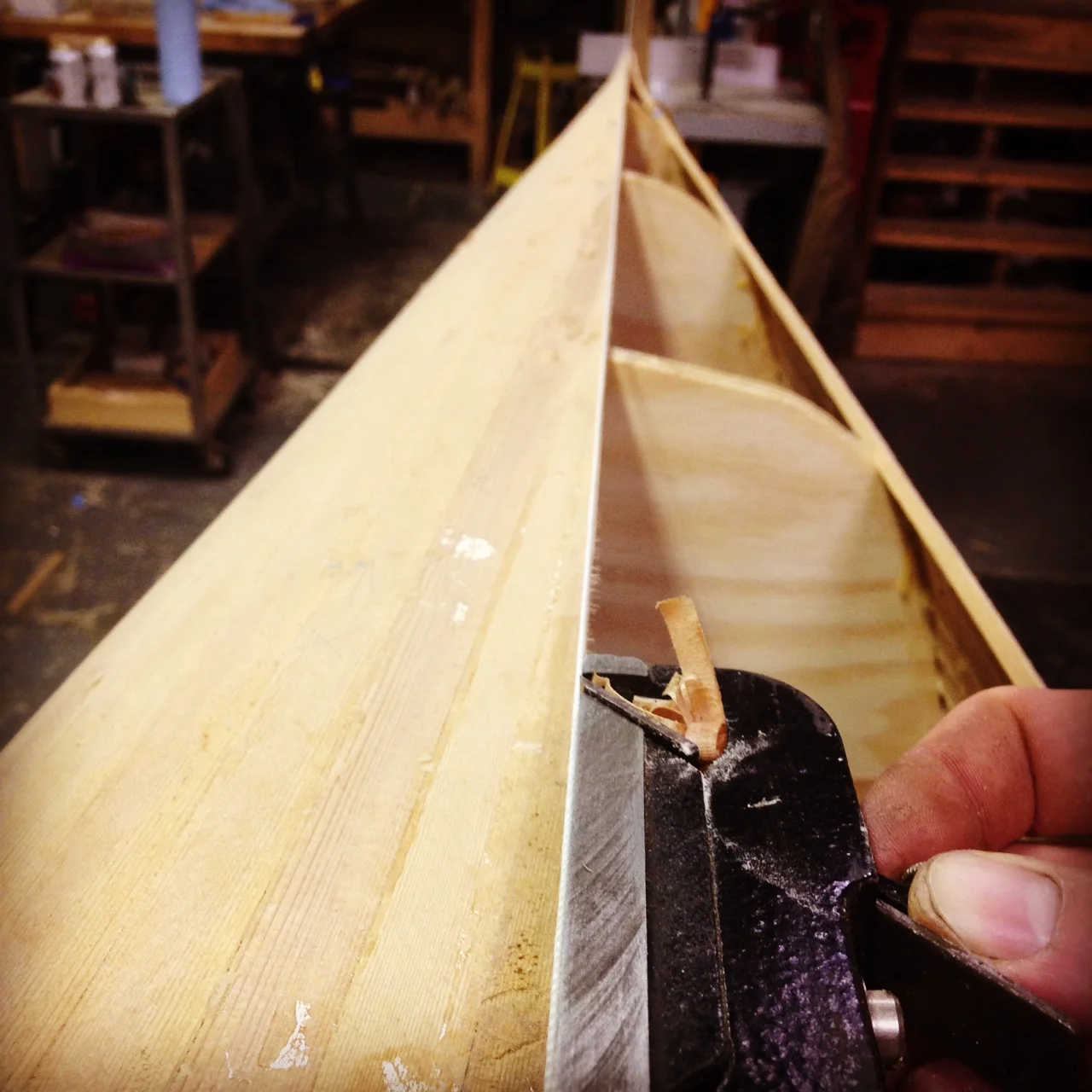Each strip must be hand planed on the skinny sides to create a tight joint with the next/previous strip. Think of a wine barrel - each strip has a angle so the slats can go around a full circle and maintain contact with each other so the barrel holds water. The challenge with these strips is that the kayak is not a circle. The angle does not just change from strip to strip, but each strip requires different angles throughout its length, and if that's not enough, it needs that on both sides! I have a tiny hand plane (not pictured) that fits in the palm of my hand and is small enough that I can run my fingers along the strip to feel the angle rolling back and fourth while pushing the plane at the same time.