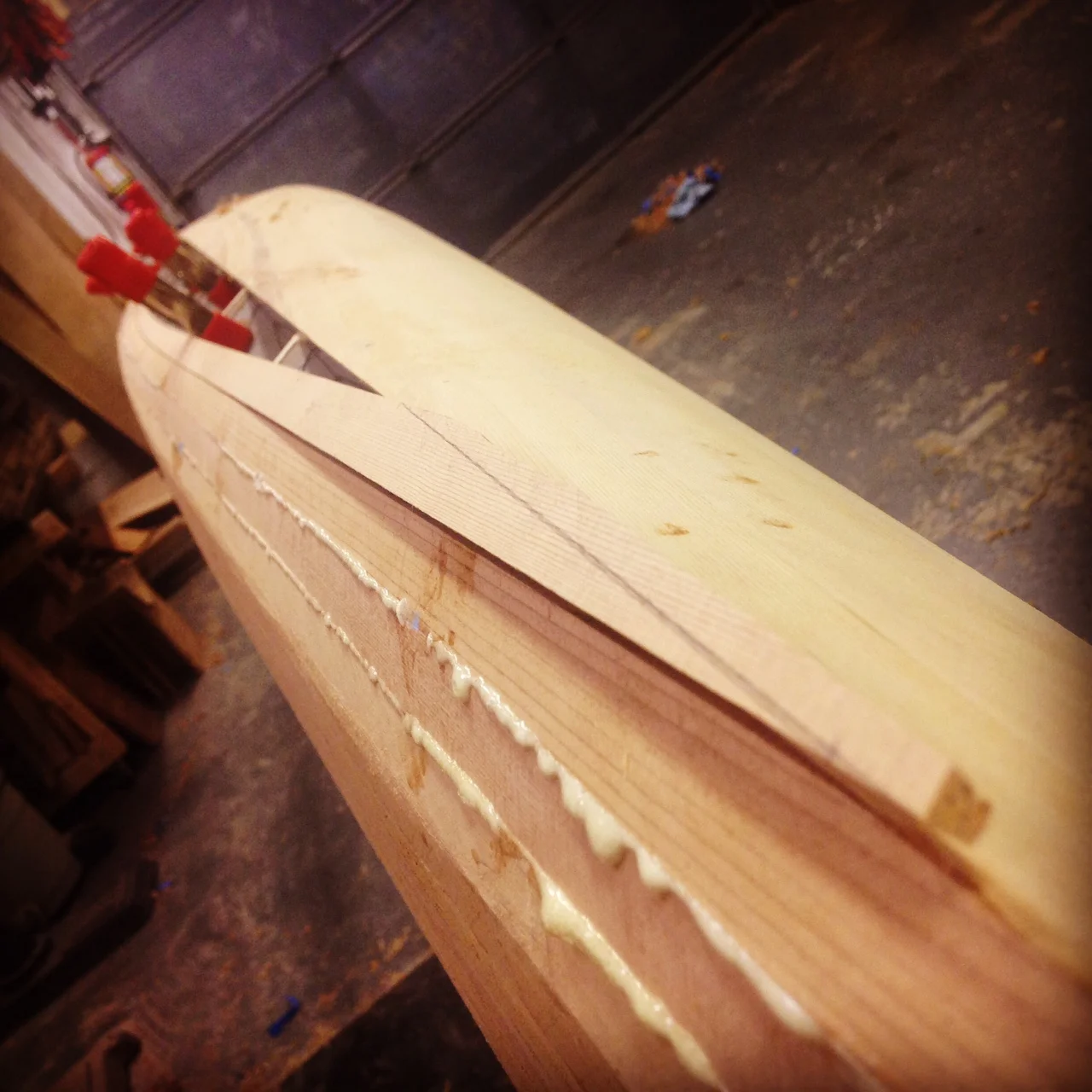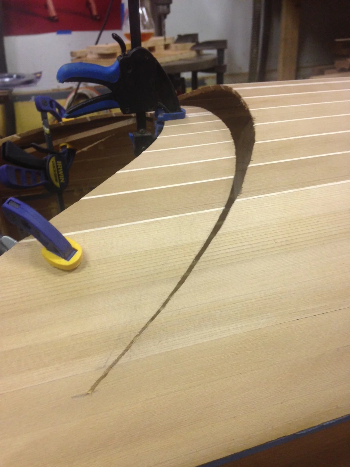 Clamping starts to get challenging - I use scraps laying around to make weges pushing the new strip into place. I've got to be careful here to not dent the cedar, as the pressure to clamp it will also cause an indentation. I always protect the edge with a wider piece to distribute the force or a harder piece of maple.