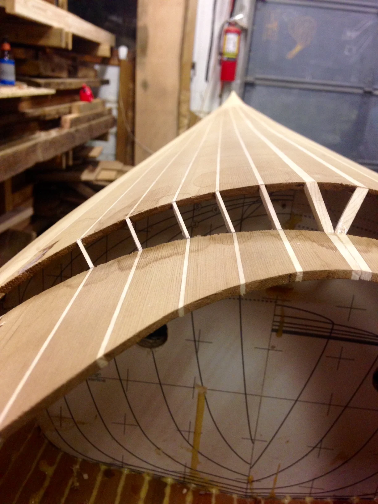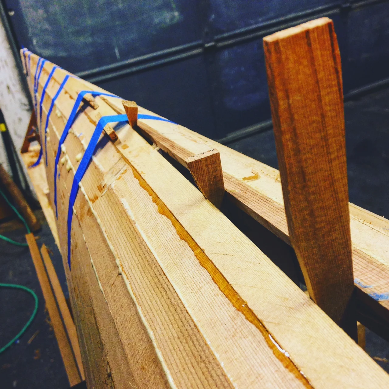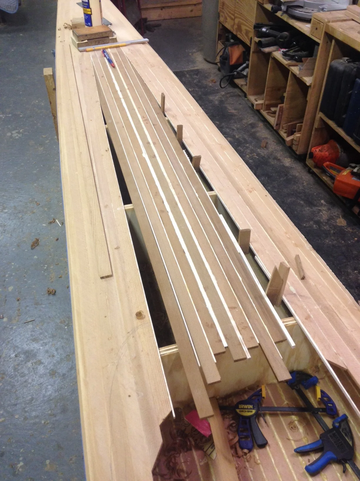 Strip after strip the deck starts taking shape. Due to the curve it's impossible to use conventional clamps, and the strips are so thin they need to have even pressure along the length of them to get a good tight joint.