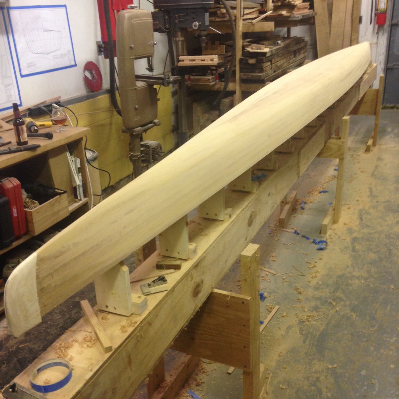 Finally the hull is stripped! The next step is possibly the most tedious of the entire building process - sanding and faring the hull into its final curved shape. Power tools of any sort are too unpredictable and could jeopardize the shape and smooth flowing curves so the only way to do this safely is by hand. I glued up several grits of sandpaper pieces of 24" x 6" plywood to make large flexible sanding pads that will bend enough to stay in contact with the hull, but also distribute the sanding pressure evenly over a large surface area to avoid digging into a particular area too much. This step takes hours and hours and hours - there is no easy way around it.