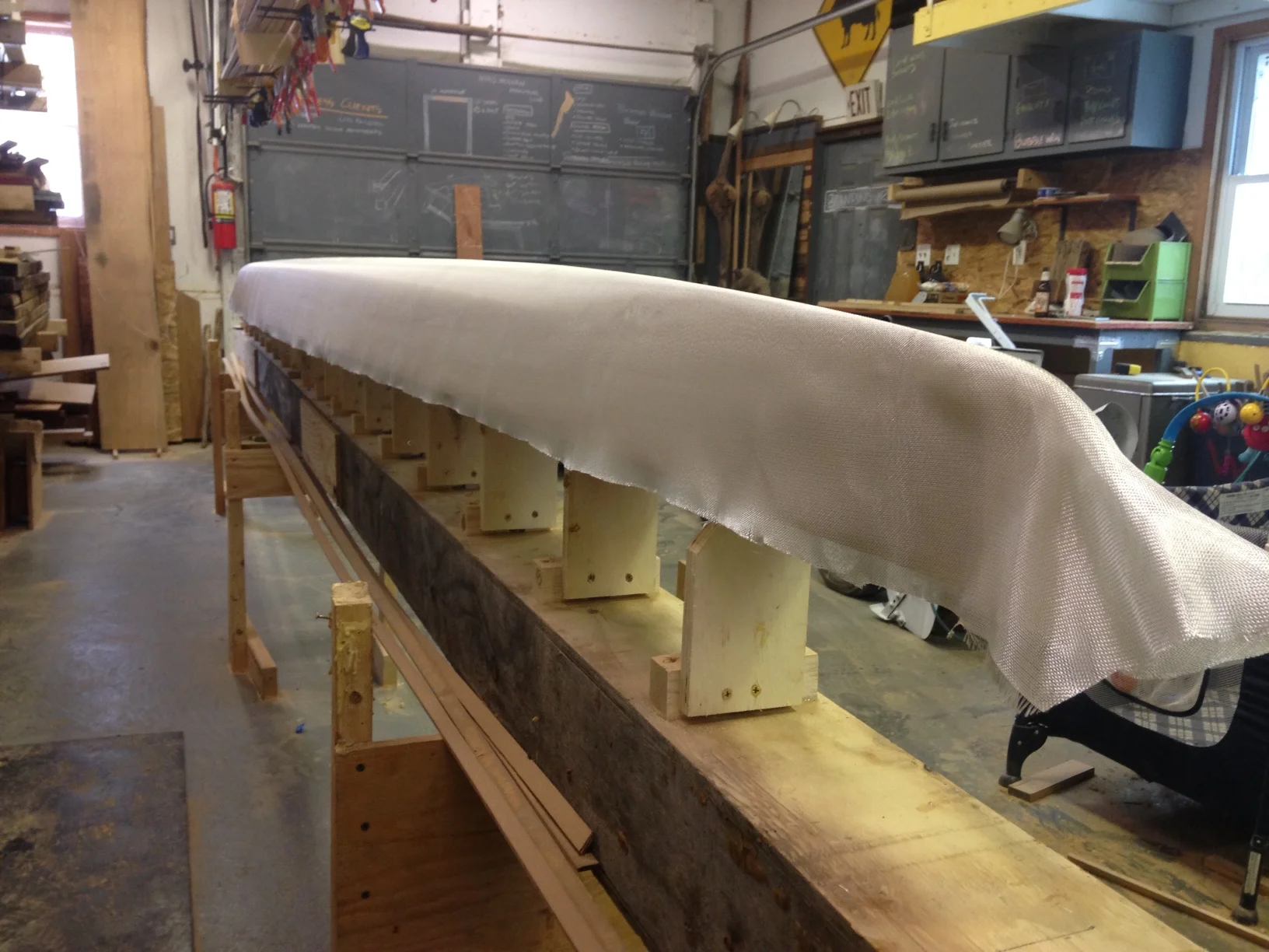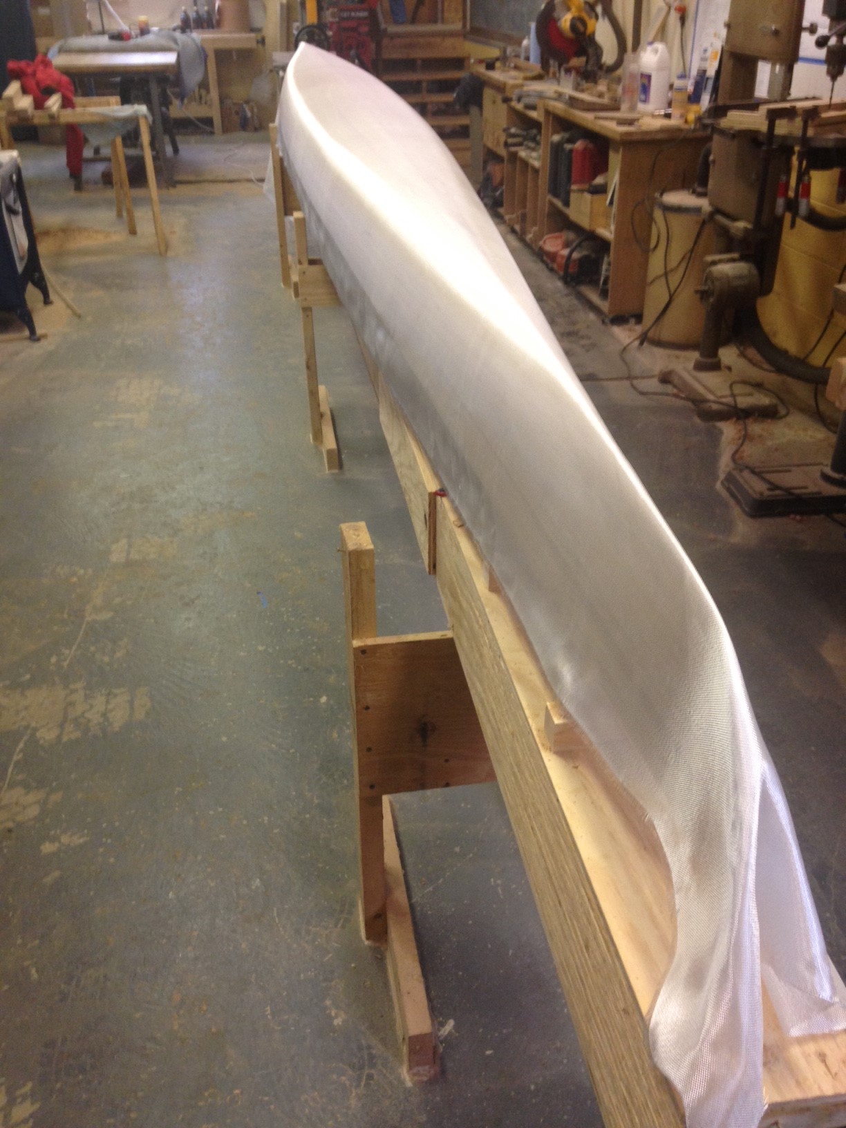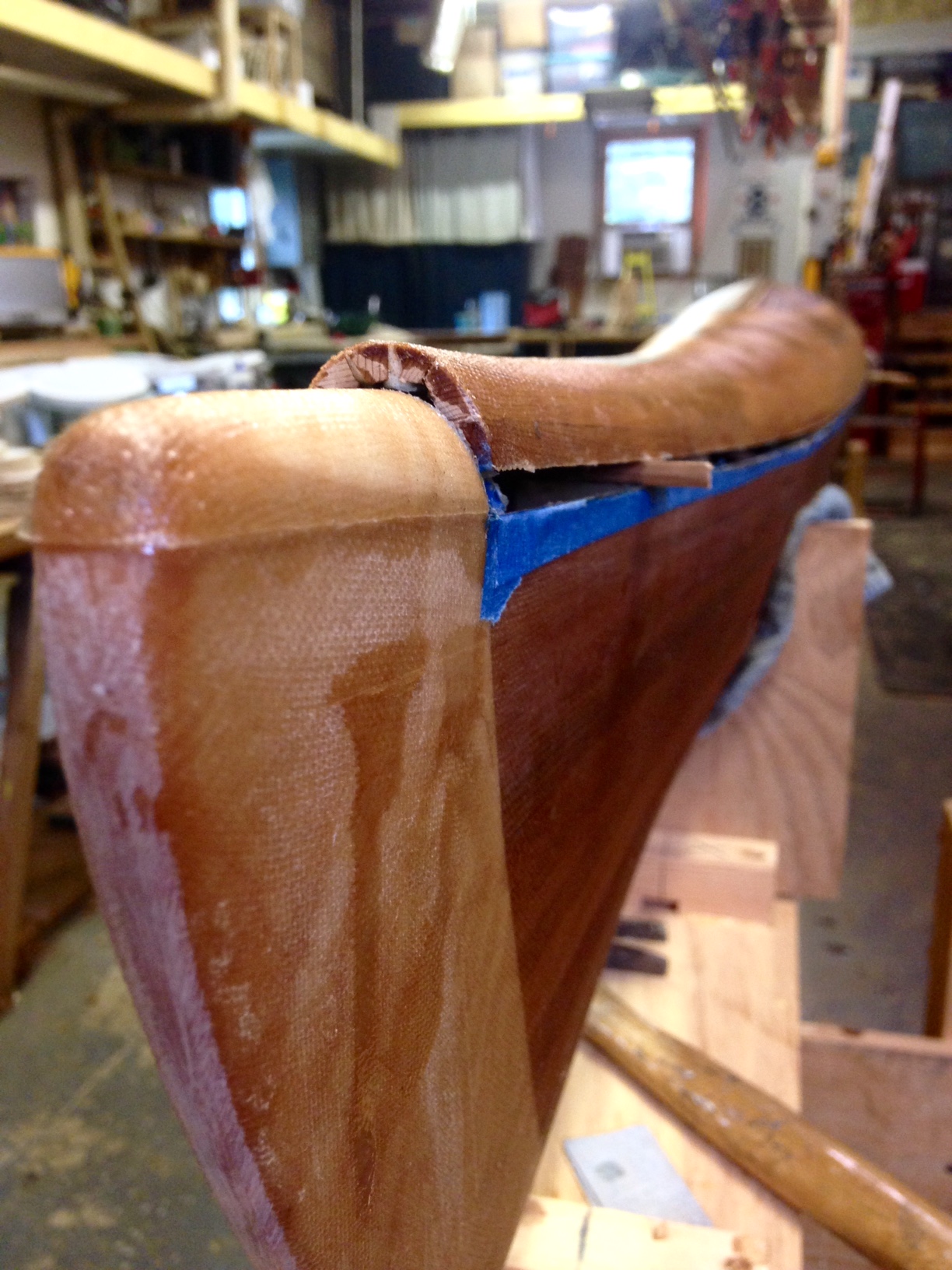 I use a flexible plastic spatula to press the resin into the fabric, and as soon as it turns clear I use the same spatula to scrape out any available excess resin. Excess at this stage is just extra weight in the finished boat. Plus, by squeezing out any extra I ensure that the fabric is in perfect contact with the wood below. The total time spent to wet out the fabric was about an hour and a half.