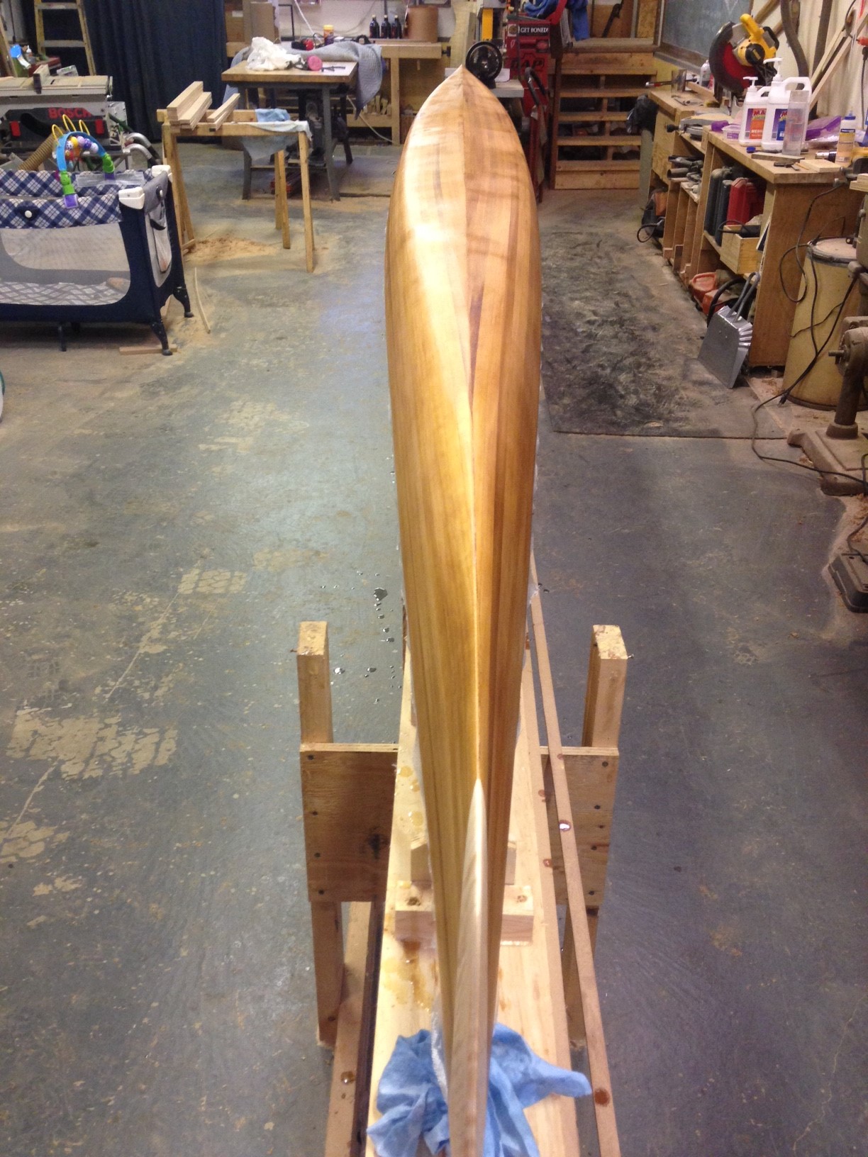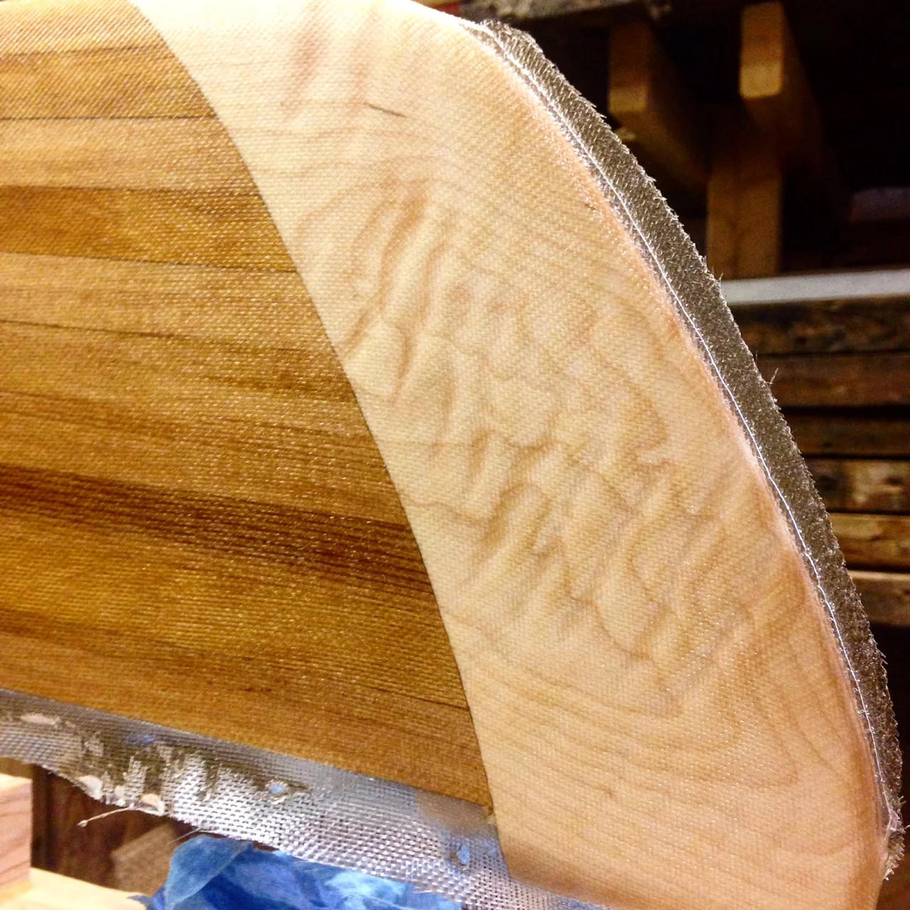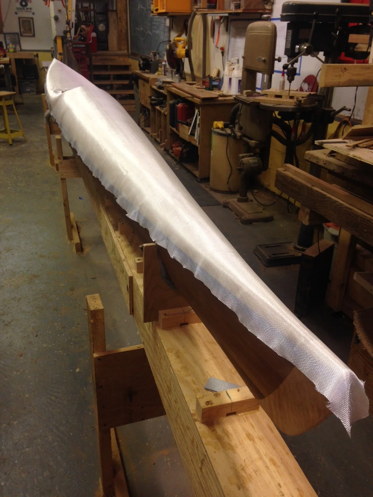 The glassing process is the same as the hull: lay on fabric, get it wet with resin, and scrape away all excess to minimize weight and make sure the glass is tight to the wood I carefully sanded to just the right shape.