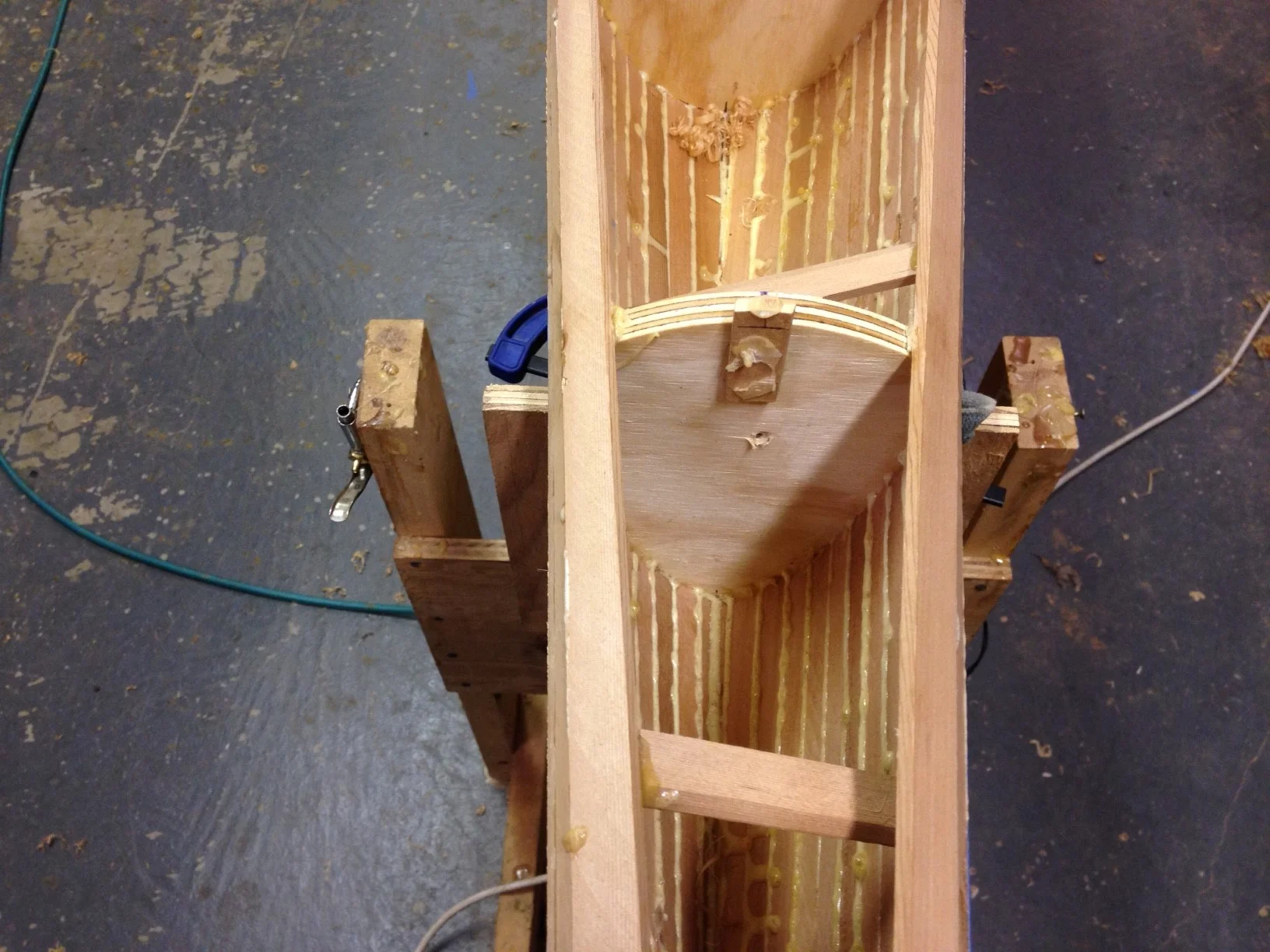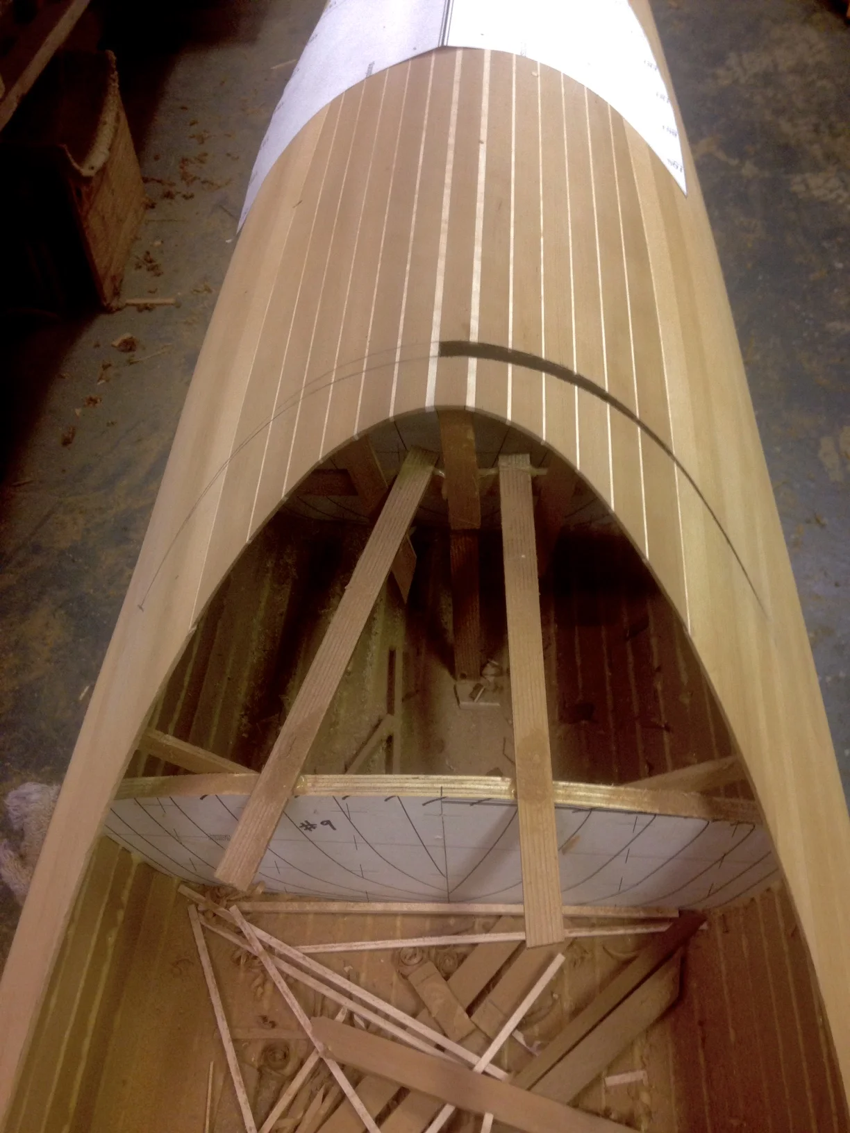 It's a little scary taking all the supports loose. Up to this point the temporary supports and forms have held everything firmly connected to the box beam below but now the forms are held in place by the dabs of hot melt glue on each cedar strip. The hull now has the strength to hold itself together and keep the forms in position relative to each other.