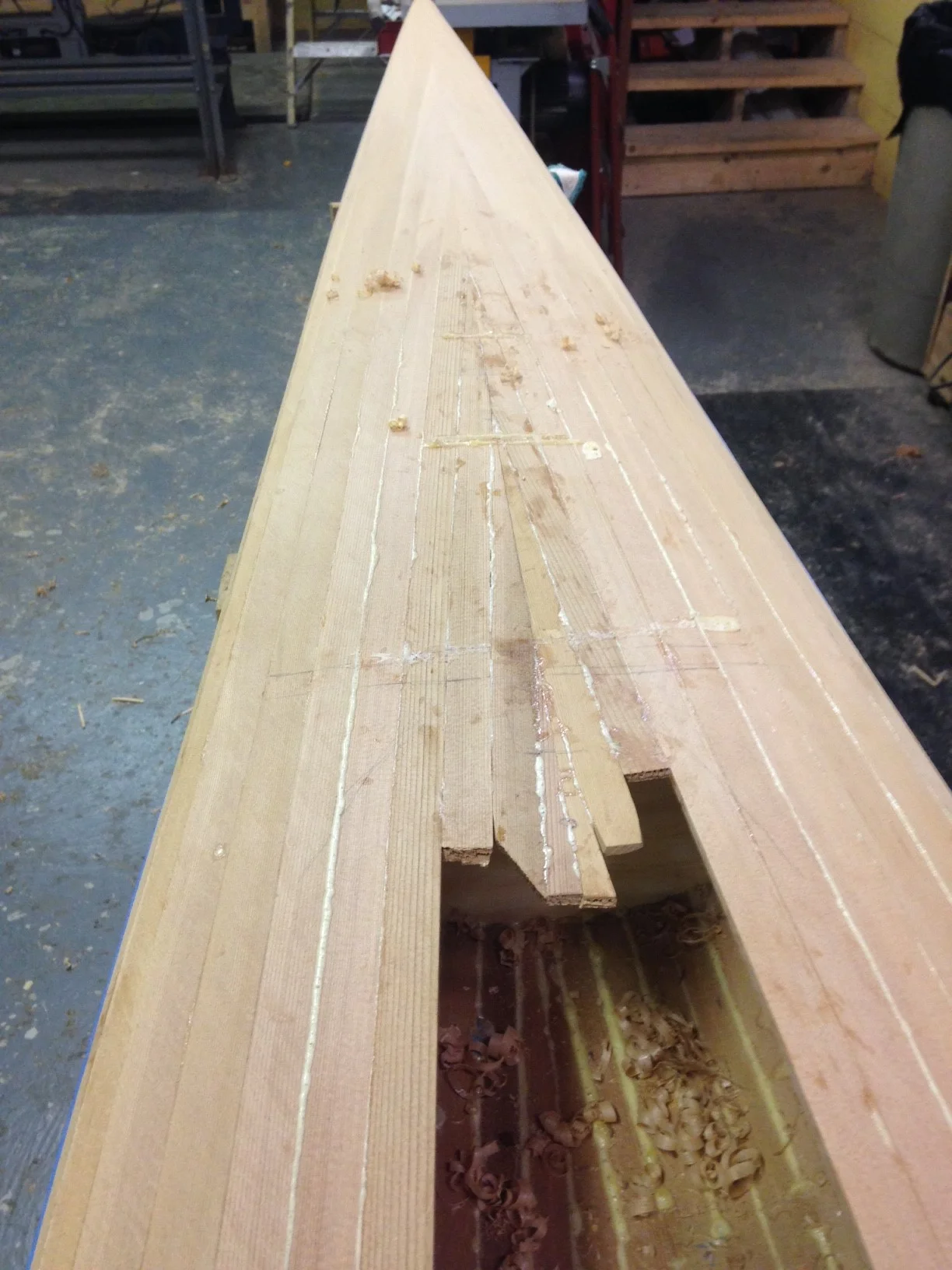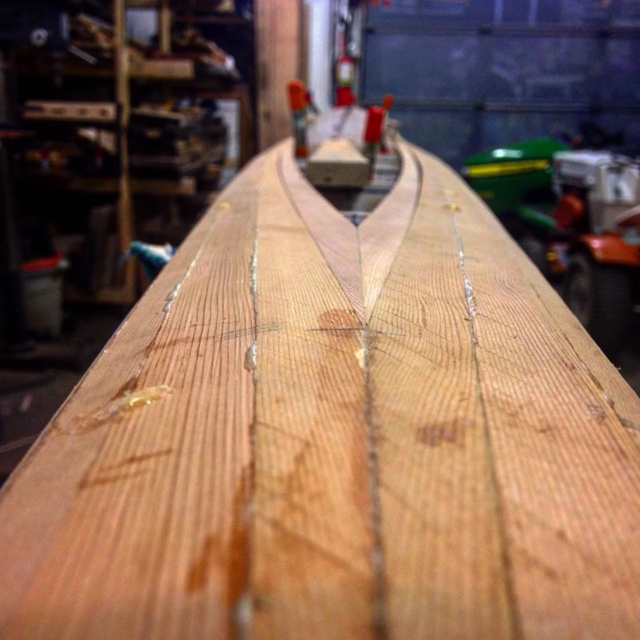 One of the challenges building a kayak nearly 20' long is sourcing material long enough to go end to end with no splice joints. As I mentioned in the previous post, I found that the longest cedar I could obtain locally was 20'. The challenge presented is that the kayak is also 20', so due to the curves the 20' strips would naturally fall short of covering the full length.