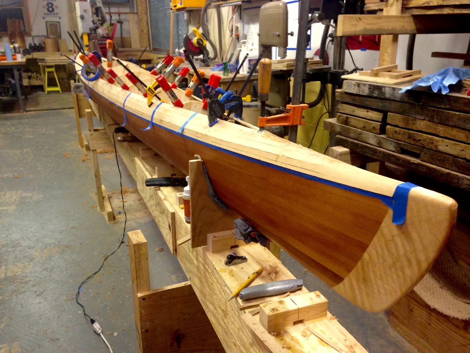 Finally the day comes to fit the last strip. This one is particularly tricky because it fits flat against the other side of the hull, yet needs to curve from nothing, out to 3/4", and back to nothing on the other side, and its 7 feet long. Plus it cannot be clamped so it needs to be a perfect fit.