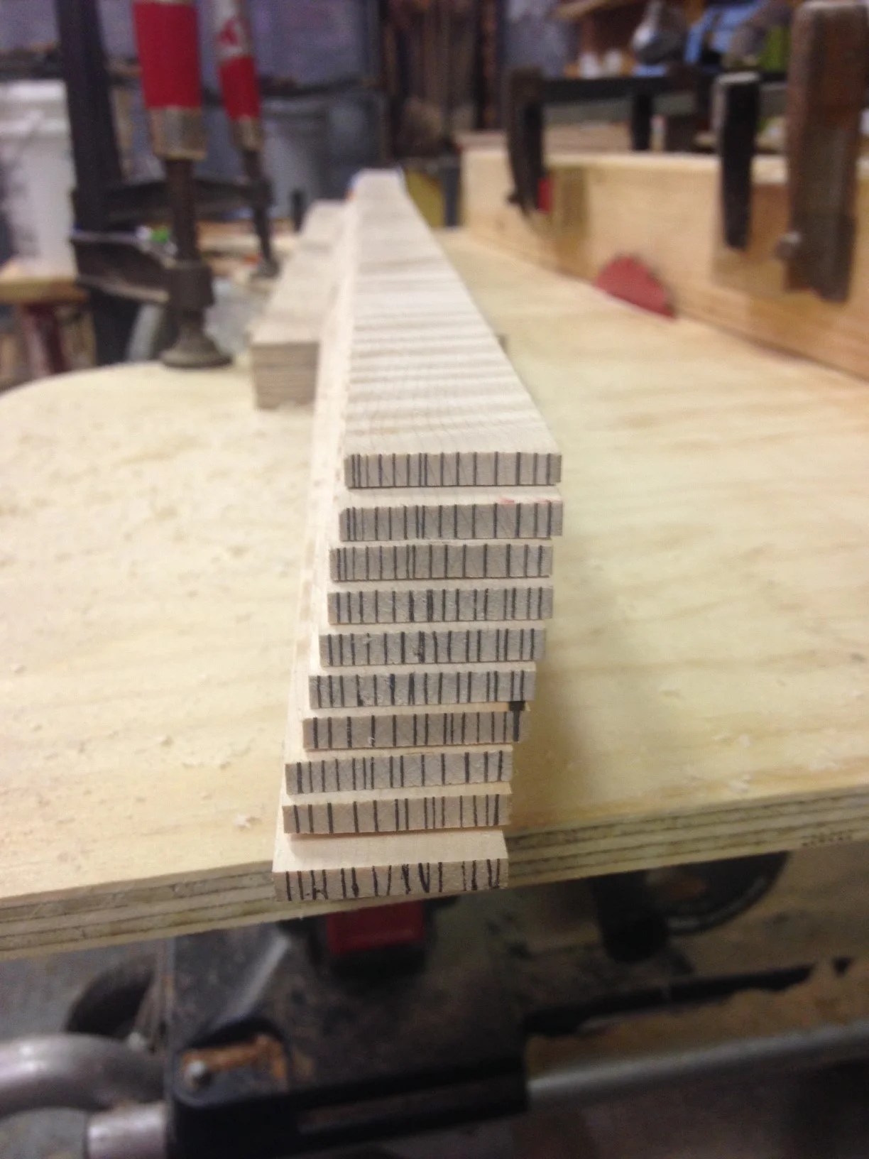 I marked the end of the board before I cut it so I could keep track of grain orientation once the strips get tiny