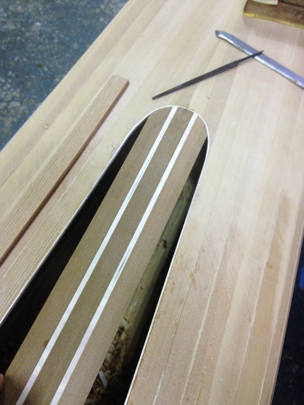 I will snap a straight line down the center of the hull once I strip past the mid point and use a plane and chisel to carve a straight line.