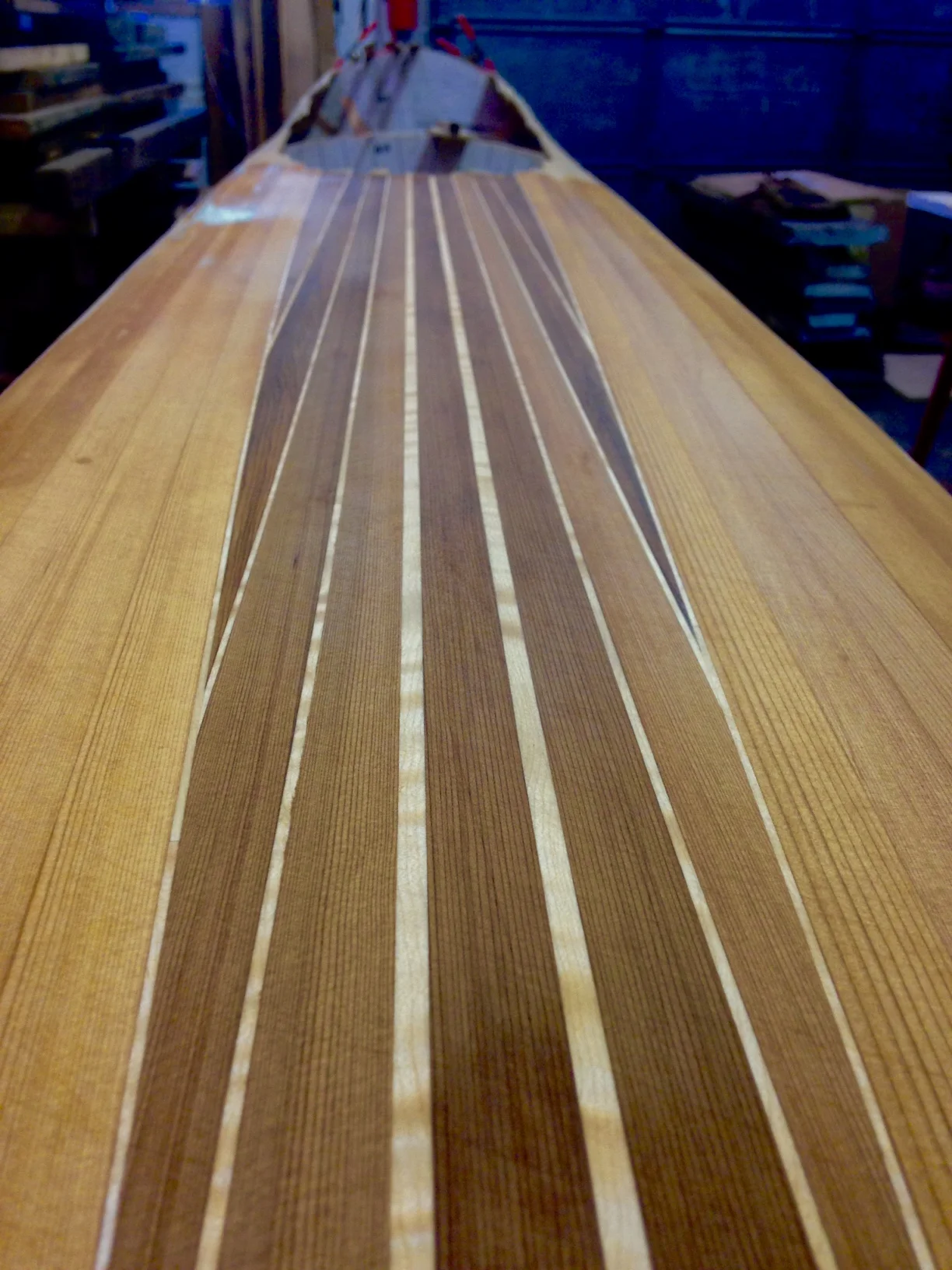 It's almost sad putting the final strip in place, but there are 10,000 steps to move on to. With the final strip fixed in place I knocked off all the glue with a sanding block and wiped on some water for a photo. I'll need to spend many more hours sanding, but this was a reassuring moment seeing the whole deck and it's colors and contrasts.