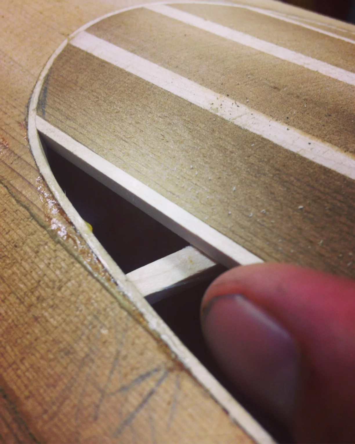 To extend the visual impact of this detailed deck area, i'm using some cedar from my last kayak that is much darker in color. This should set it apart from the rest of the boat, and create a more dramatic contrast against the nearly white color maple