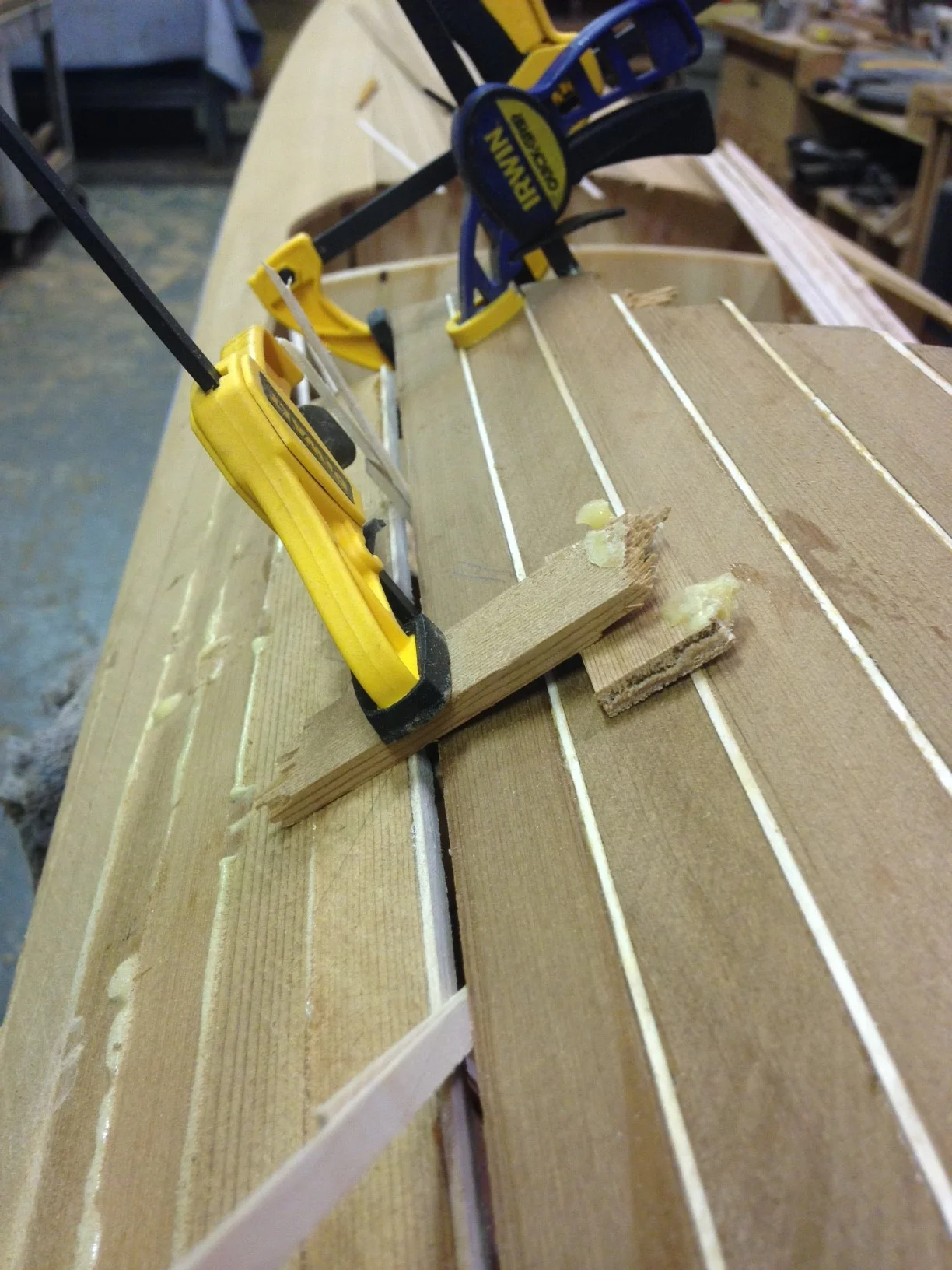 I started by determining how much of the deck I could cover with the parallel strips without losing the balance of the curved strips that started at the shear line. I installed a few short strips to infill the narrow gap at the bow and stern where the full length strips diverged.