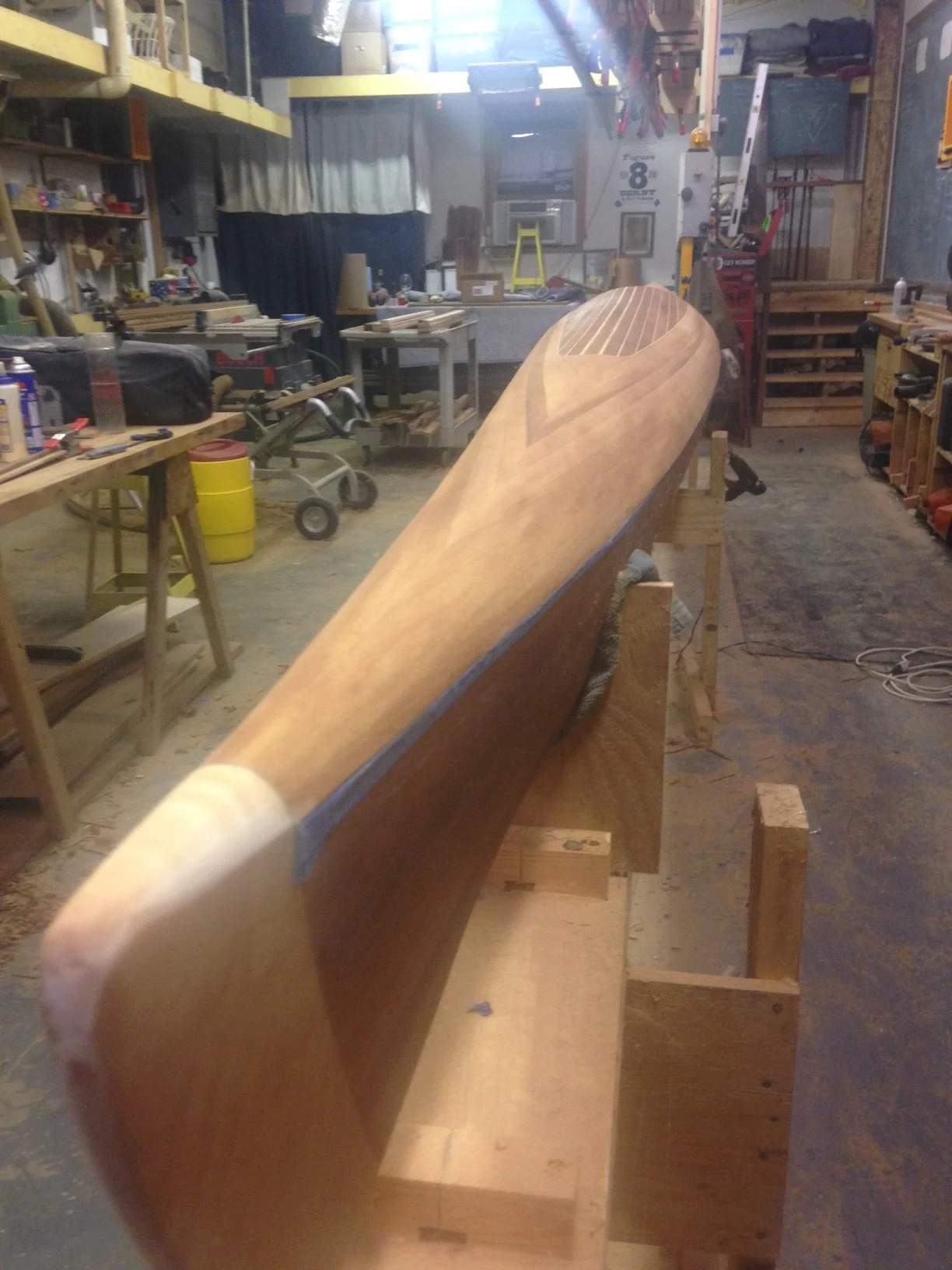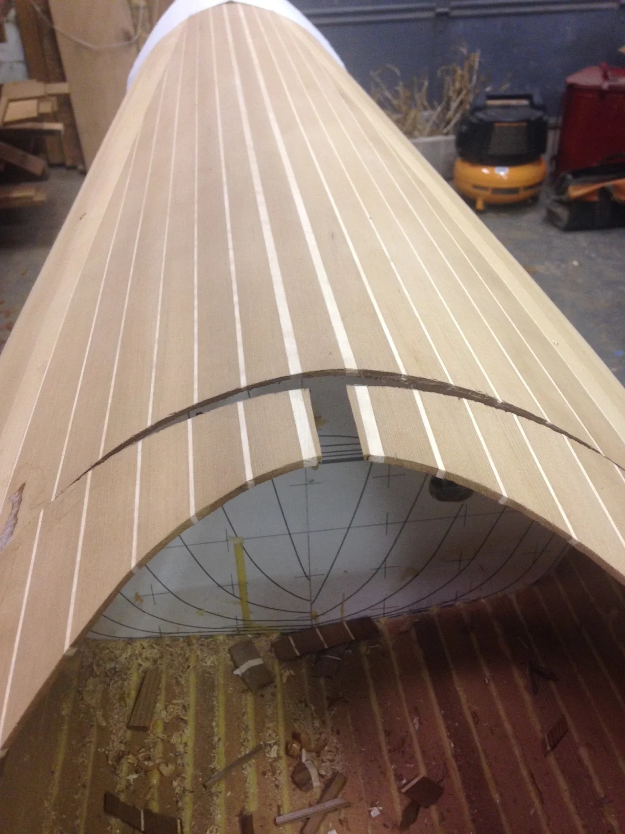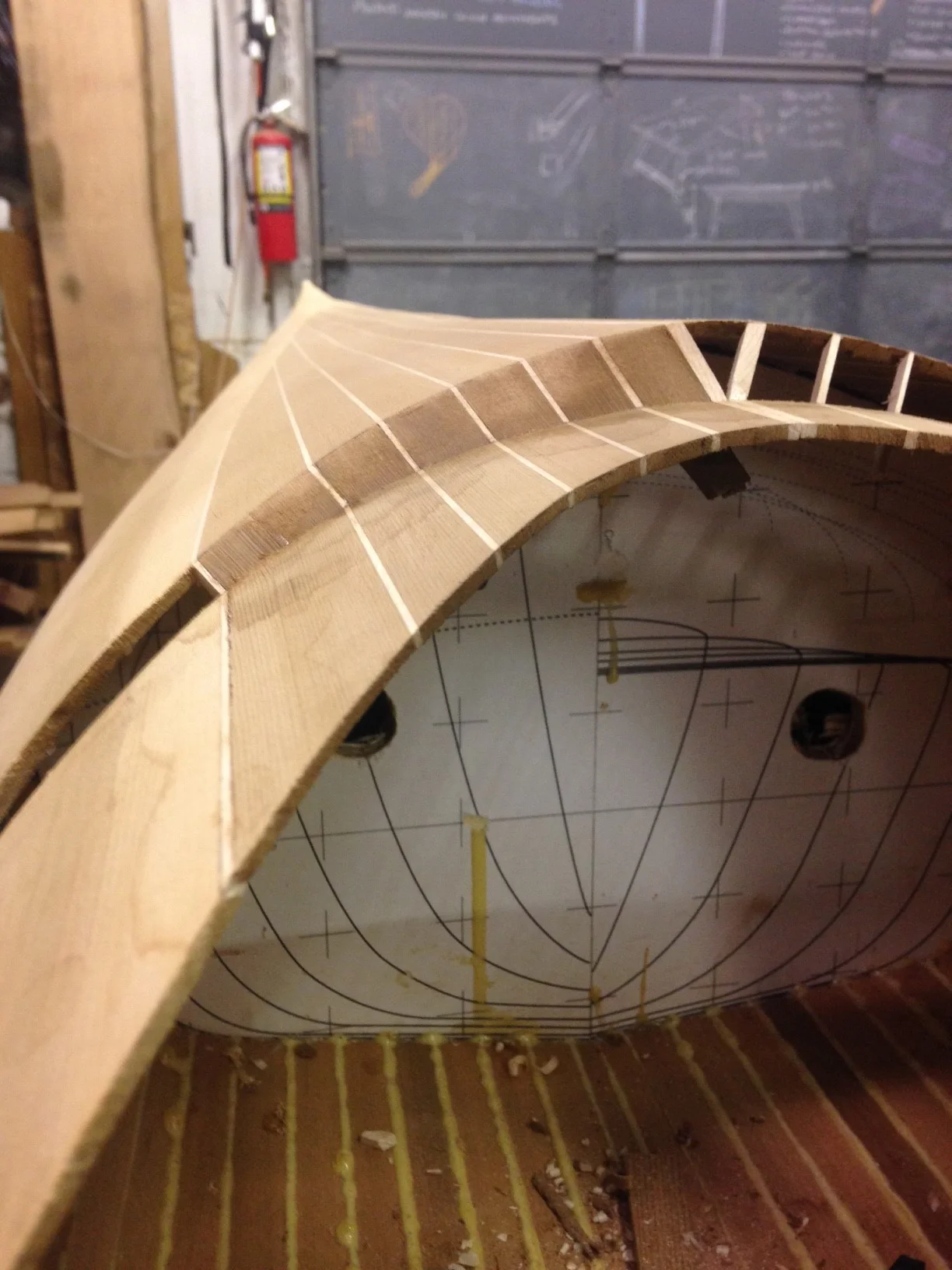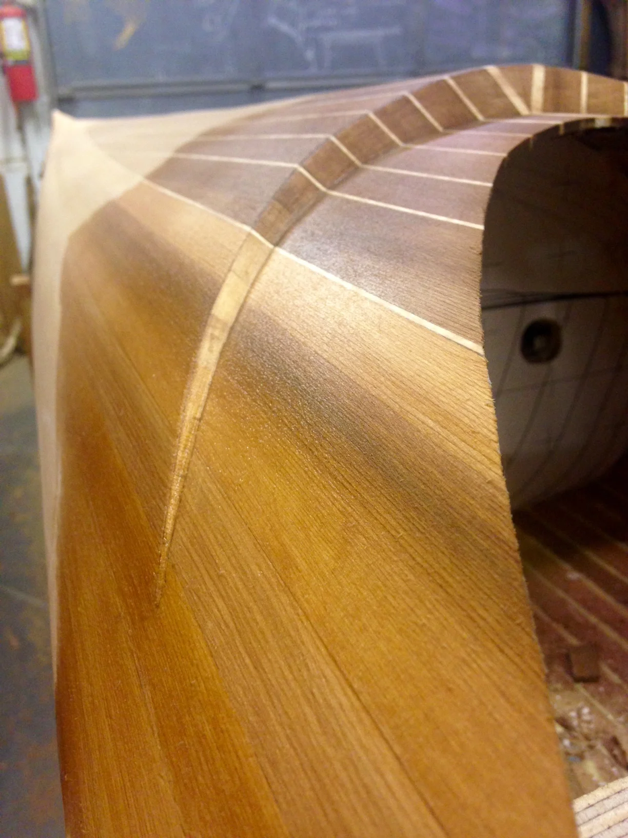 The rear half of the deck was relatively flat, which made all the strips quick and easy to fit together. The bow on the other hand, has a great deal of curve, so each strip must be tapered on both sides much like a whiskey barrel.