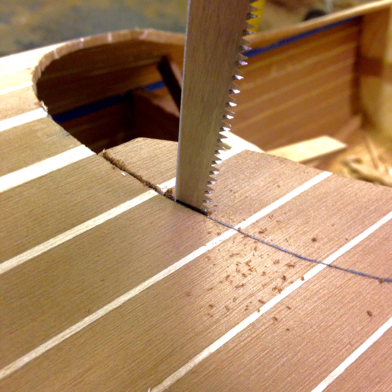 I cut out the final cockpit opening with a narrow Japanese pull style saw, but found that even with an incredibly sharp saw it was tricky to cut because the deck is so thin that only one or two saw teeth are ever engaged in the wood at any time, and it tries to catch and snag. To control tear out I went over my pencil line with a razor knife to control fibers from lifting out beyond where it wanted them to.