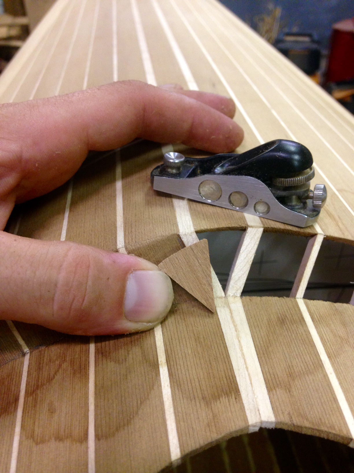 Where the strips hit the curved maple piece they tend to try and "dive" into the kayak which would cause a sanding and deck shape nightmare. To avoid this I use tiny pieces of scrap and glue them to the underside of the strips flanking the opening where the new strip needs to lay.